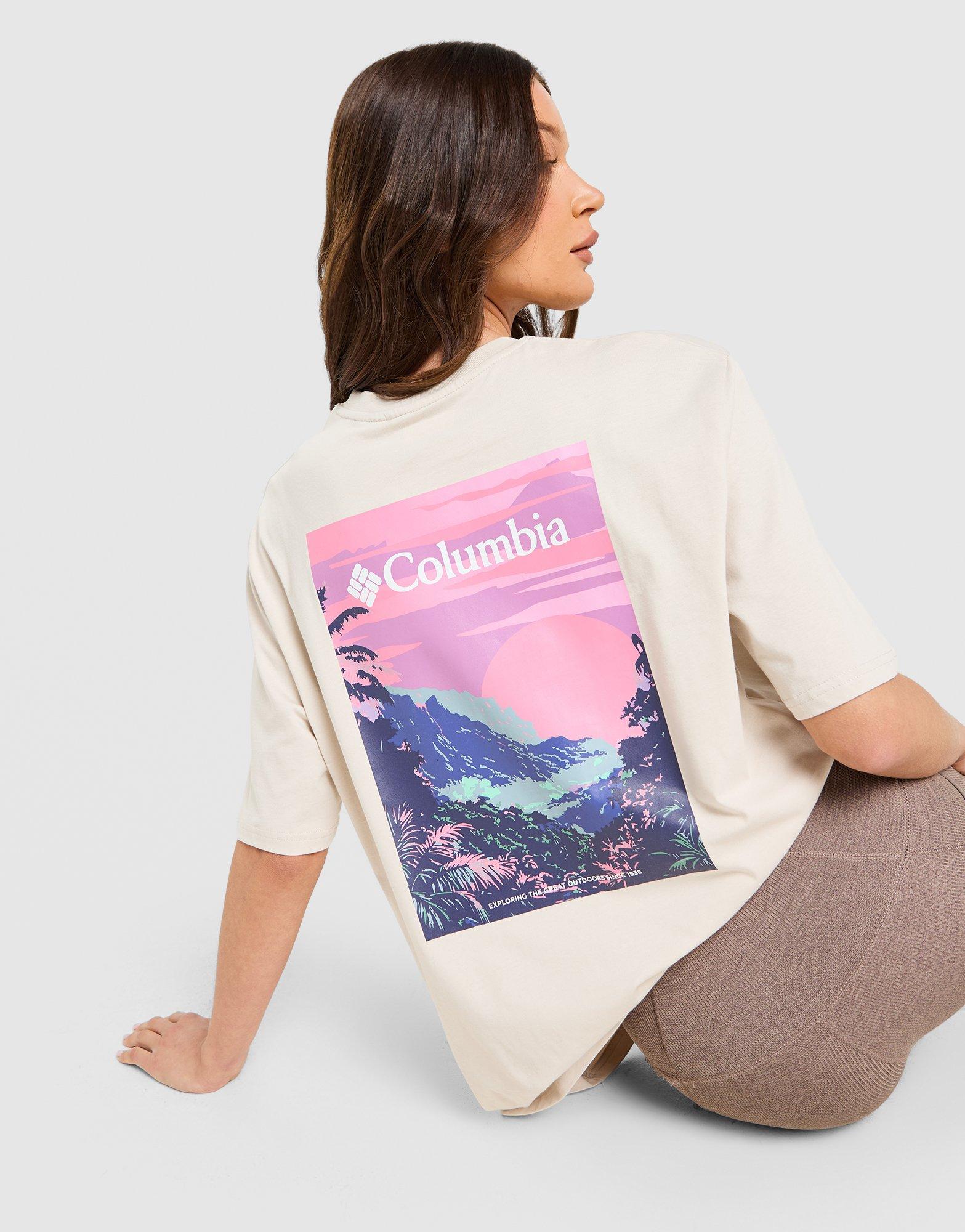 Outdoor vibes on the daily. This women's View T-Shirt from Columbia lands exclusively at JD. Cut from soft beige cotton, this relaxed-fit tee has a ribbed crew neckline and short sleeves for a chilled look. Finished up with a bold back graphic and signature Columbia logos. Machine washable. | Our model is 5'10" and wears a size S.