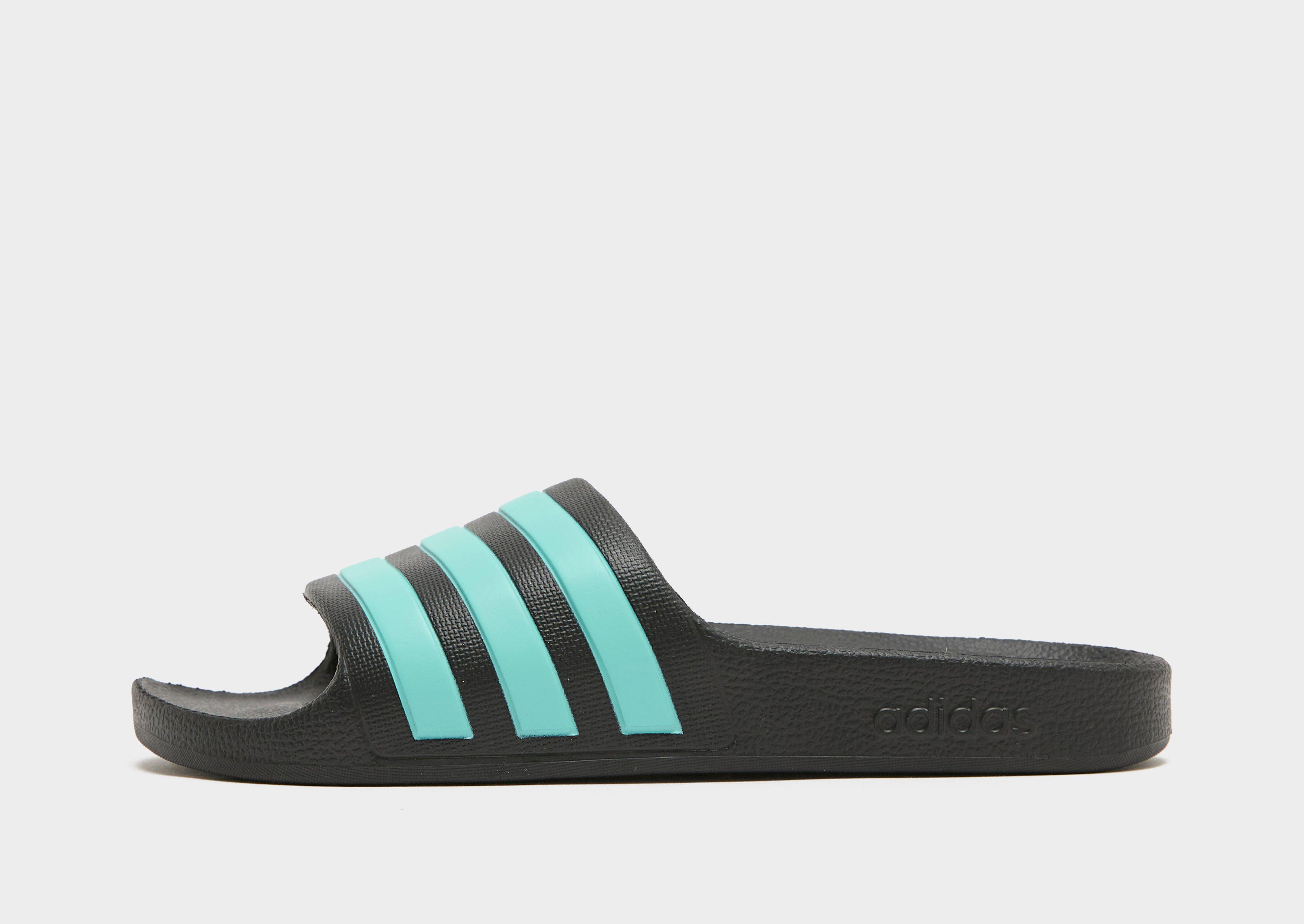 From the pool to the beach, these juniors' Adilette Aqua Slides from adidas will be your go-to this summer. In Core Black, theyve got a padded synthetic strap to lock you in. They have a cushioned footbed for extra comfort, with a one-piece, high-abrasion EVA outsole for grippy traction. Finished with Flash Aqua 3-Stripes and adidas branding. | JS2497