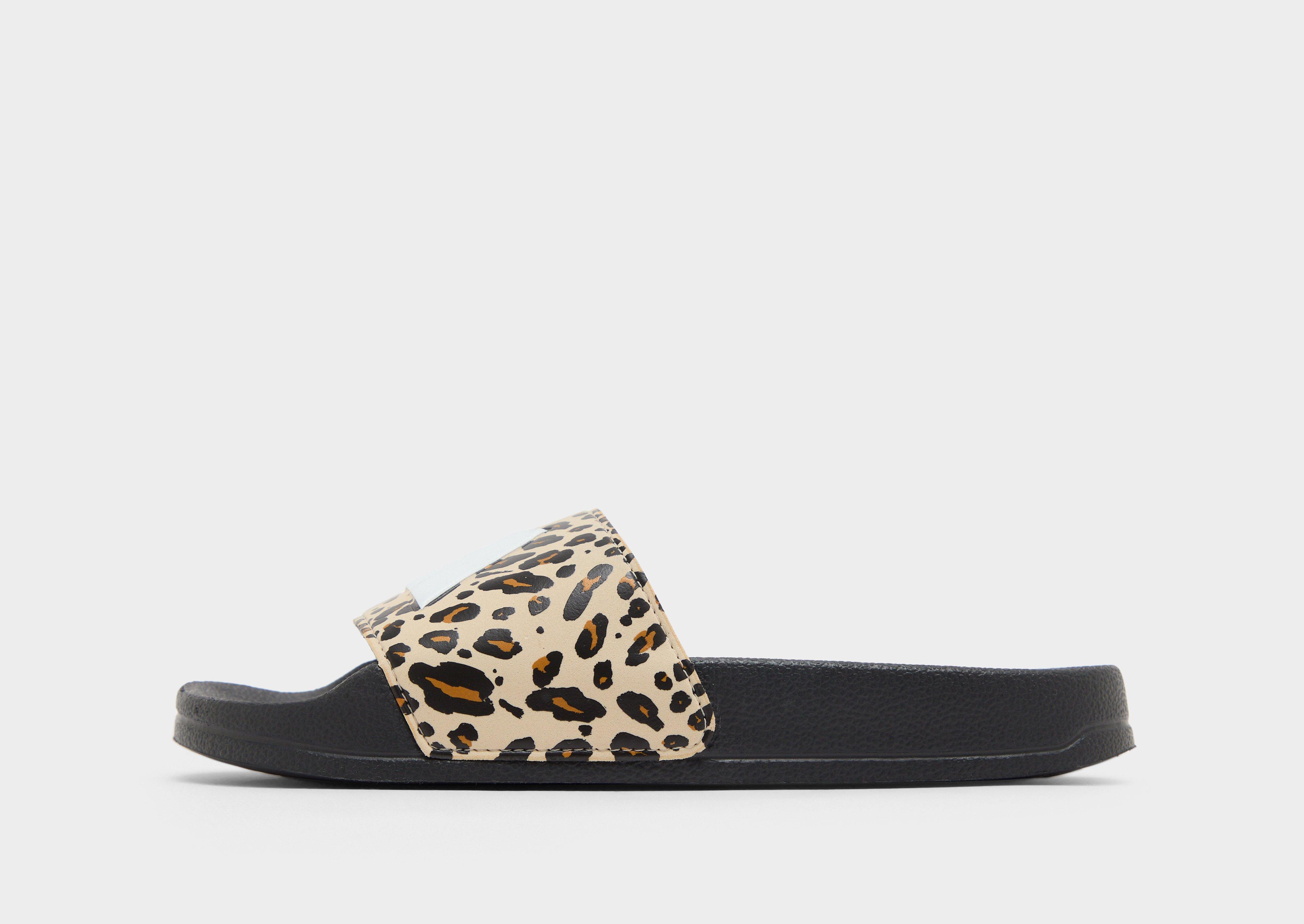 Beach days incoming? These children's adidas Adilette Shower Slides are crafted with a one-piece EVA sole, making them ultra light and waterproof. They've got a black contoured footbed with soft cushioning, and a leopard-print bandage strap. With a lightly textured tread for grip, they're finished with a bold adidas logo up top. | IH9586_