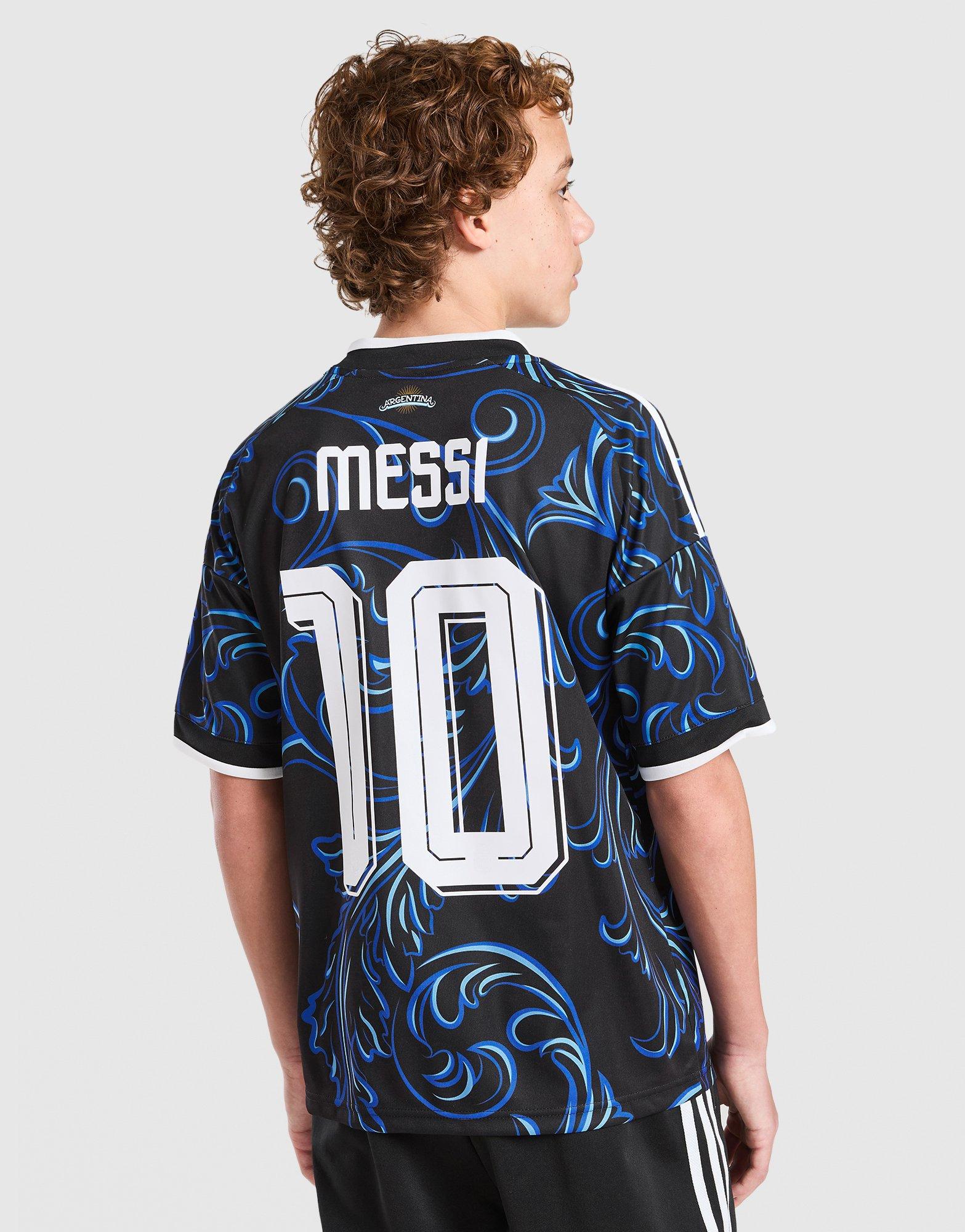 A big summer ahead for the current world champions. Back em in this juniors' Argentina 2026 Away Shirt from adidas Originals. In Black, it's got a Lucid Blue and Blue Burst spiral pattern inspired by the country's vibrant culture. A crew neckline and short sleeves link up to keep things classic. CLIMACOOL tech is there to deal with sweat. The iconic 3-Stripes run down the sleeves, and an Argentina sign-off features on the nape. Finished with a Trefoil logo and Argentina crest to the chest. Machine washable. | KH3942