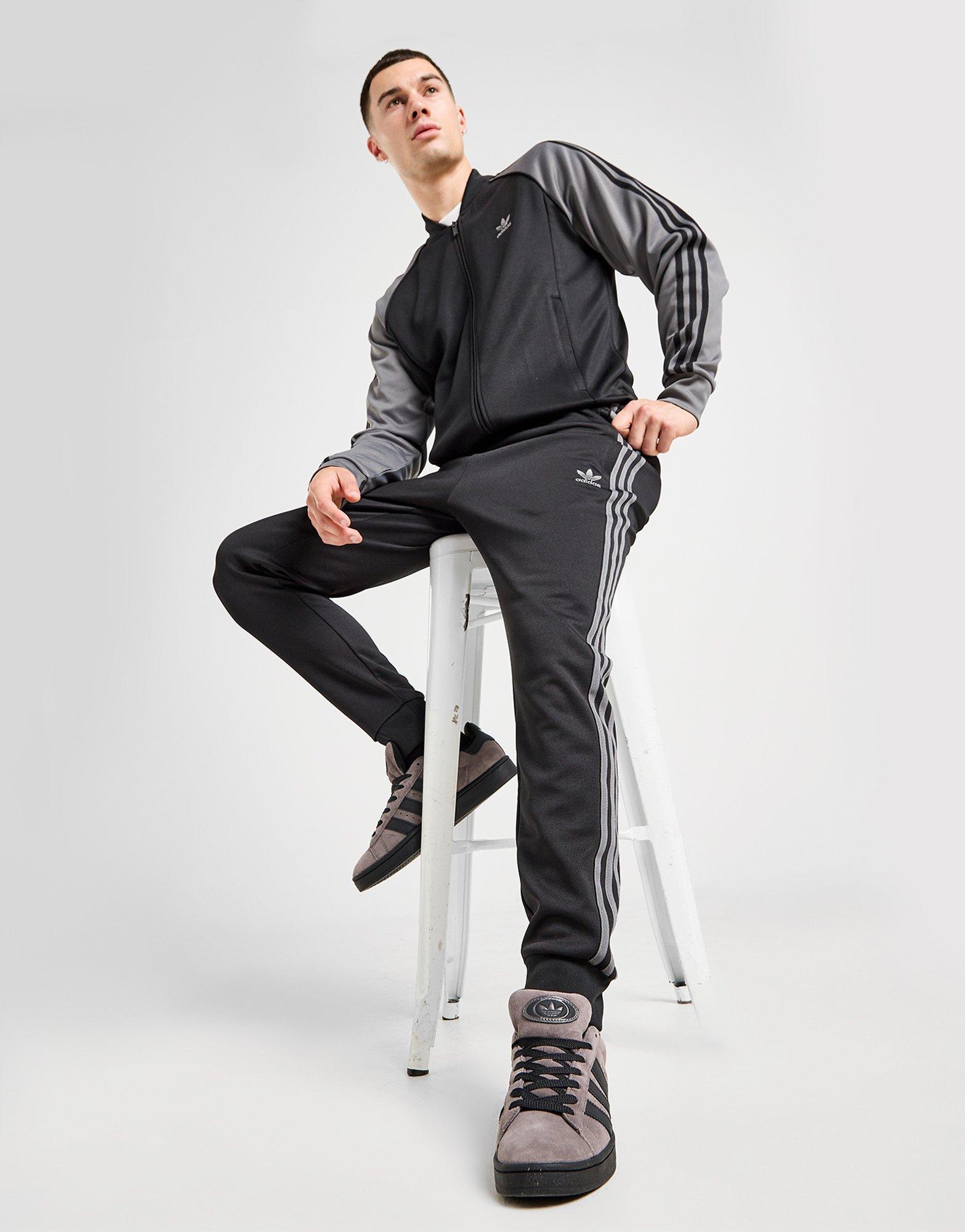 Rep these men's SST Track Pants for a fresh look on the street or the sofa. Landing in a Black colourway, these slim fit track pants are crafted with a partly recycled blended fabric that's smooth and breathable for total comfort. They feature an elastic waistband for a relaxed feel, cuffed ankles so you can flex your kicks, and zippered pockets to keep your staples close. Signed off with the Trefoil to the thigh. Machine washable. | Our model is 6'0" and wears a size medium. | IY9869
