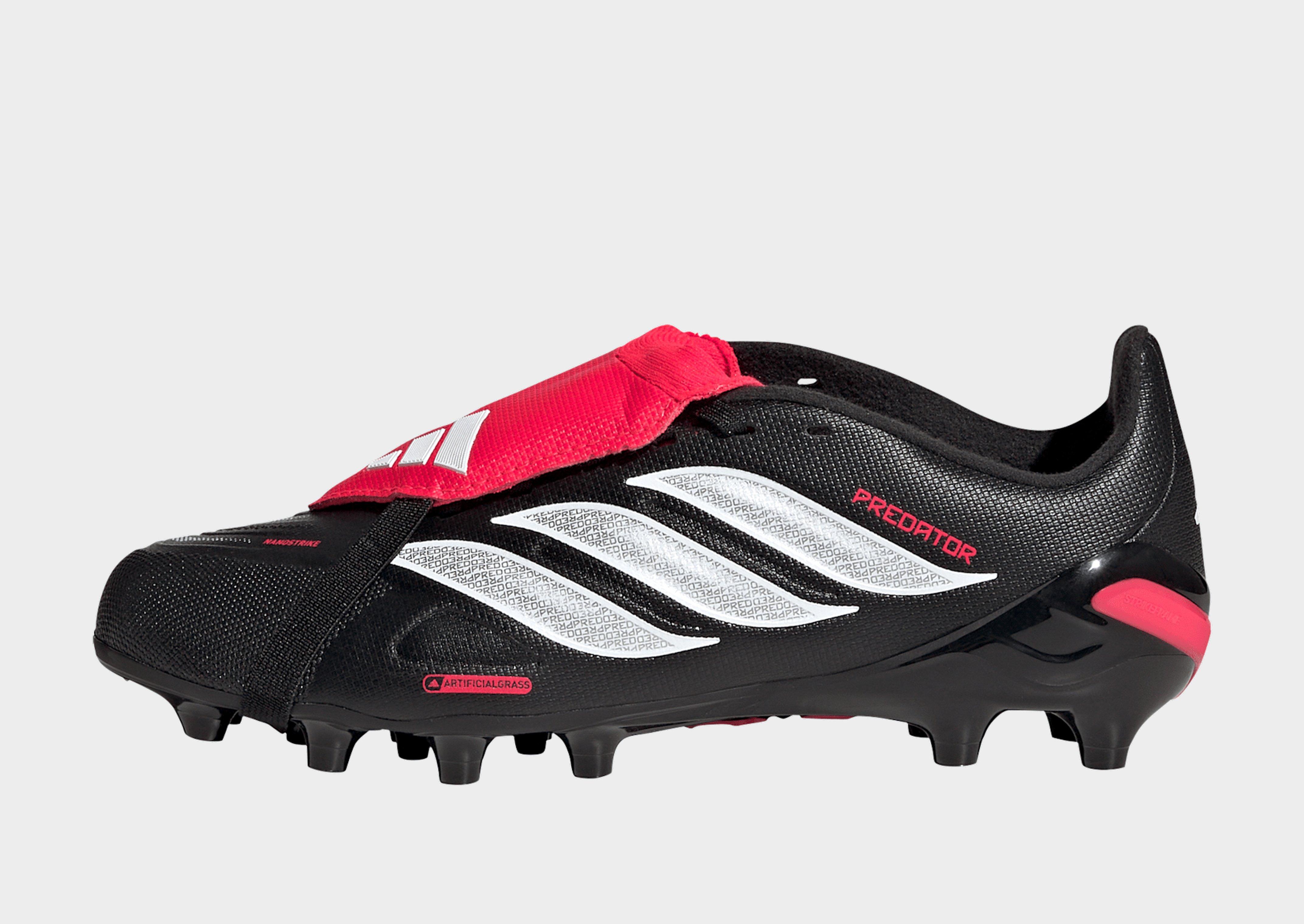 Give young football stars a boost in the Predator League Fold-Over Tongue Football Boots, designed for control and precision on artificial grass. A striking design comes together with game-changing innovation to make an impact on your kids – and a difference on the pitch.Nanostrike technology reimagines the synergy between fit and grip tech. The mesh upper is built for extra softness and lightness, with a haptic overlay for enhanced striking precision. Powerspine tech takes care of midfoot stability to create a stronger shot. In other words, these boots were made to go for goal.A robust yet flexible outsole keeps active feet grounded, giving kids the confidence to leave it all on the pitch. The classic fold-over tongue makes young players feel pro, while helping to improve ball control and accuracy.For kids bursting with energy and potential, these boots make the difference between liking and loving practice. Embrace the adidas spirit, where every goal is within their reach.