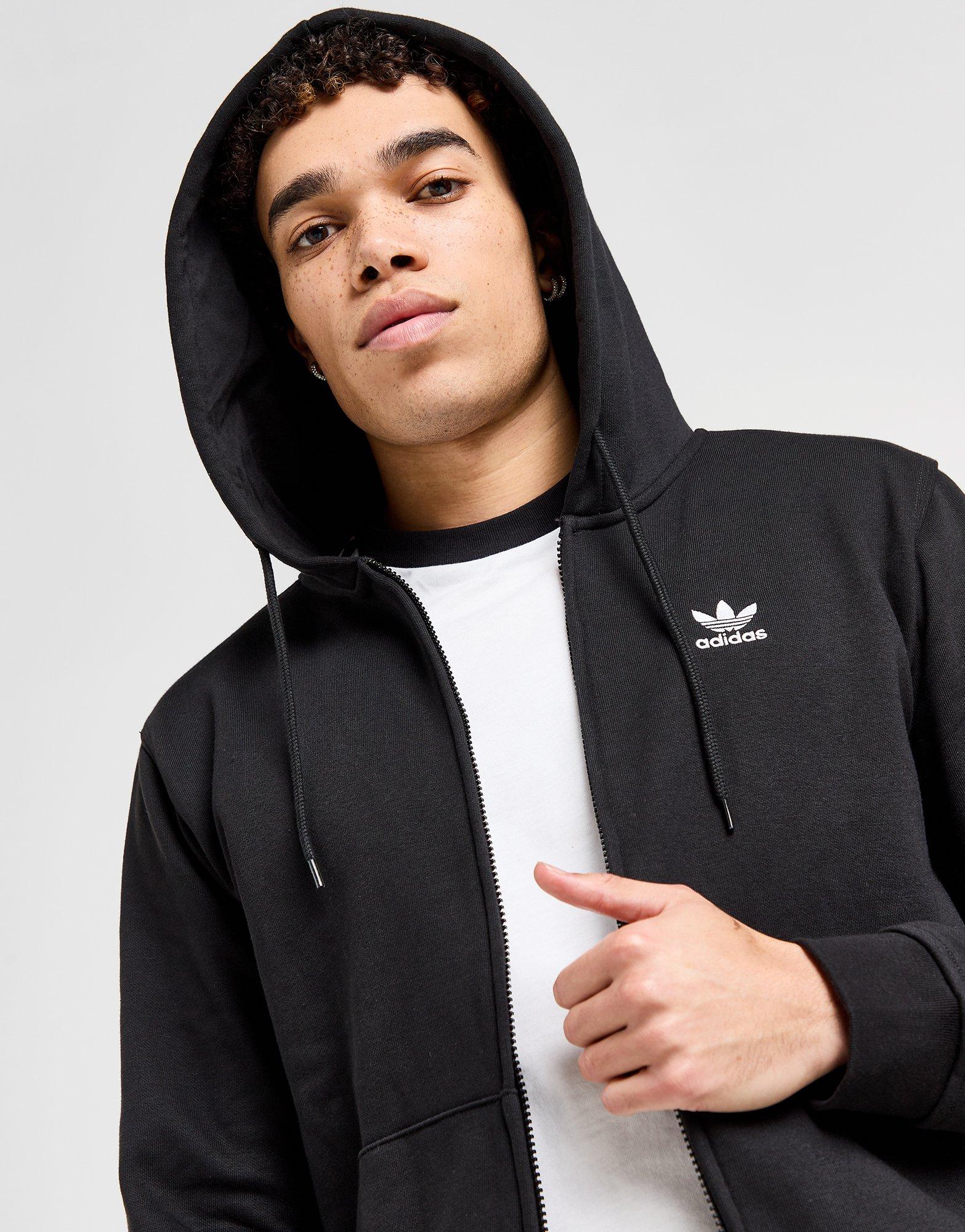 Freshen up your casual layers with this men's Trefoil Essentials Full Zip Hoodie from adidas Originals. In a Black colourway, this regular-fit hoodie is cut from a soft cotton blended fleece that uses recycled materials for lasting comfort. It features a full zip fastening and a drawcord-adjustable hood so you can customise the coverage, with ribbed trims to the hem and cuffs to hold the shape. With a kangaroo pocket up front for storage, it's signed off with a Trefoil logo to the chest. Machine washable | Our model is 6'1" with a 38" chest and wears a size medium. | IW5791