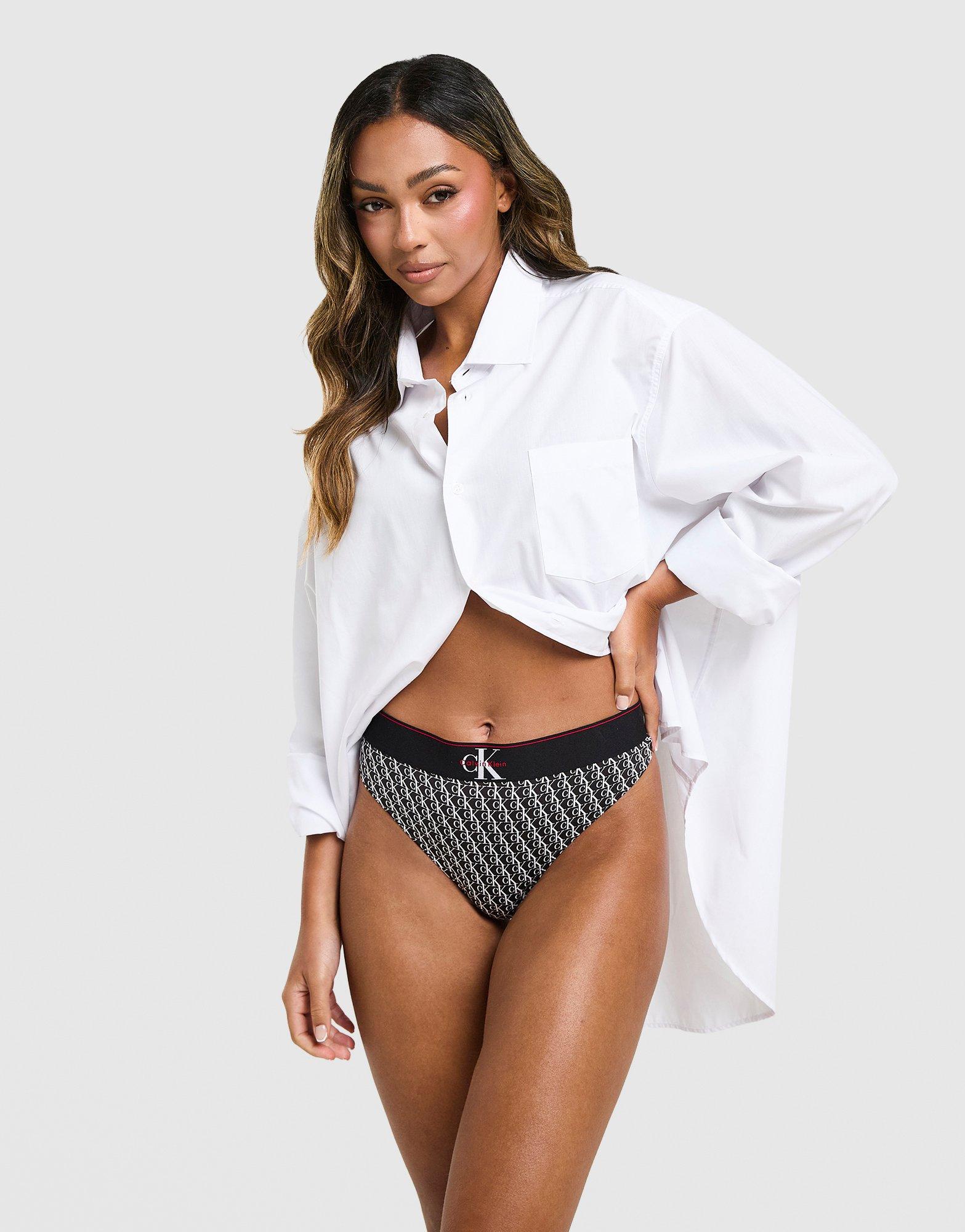 Grab the essentials. This women'd CK96 All Over Print Thong from Calvin Klein is cut from soft anf stretchy fabric. It features an elastic waistband with a mid-rise and is finished with signature branding throughout. Machine washable | Our model is 5'8" and wears a size S. Note: underwear can not be returned.