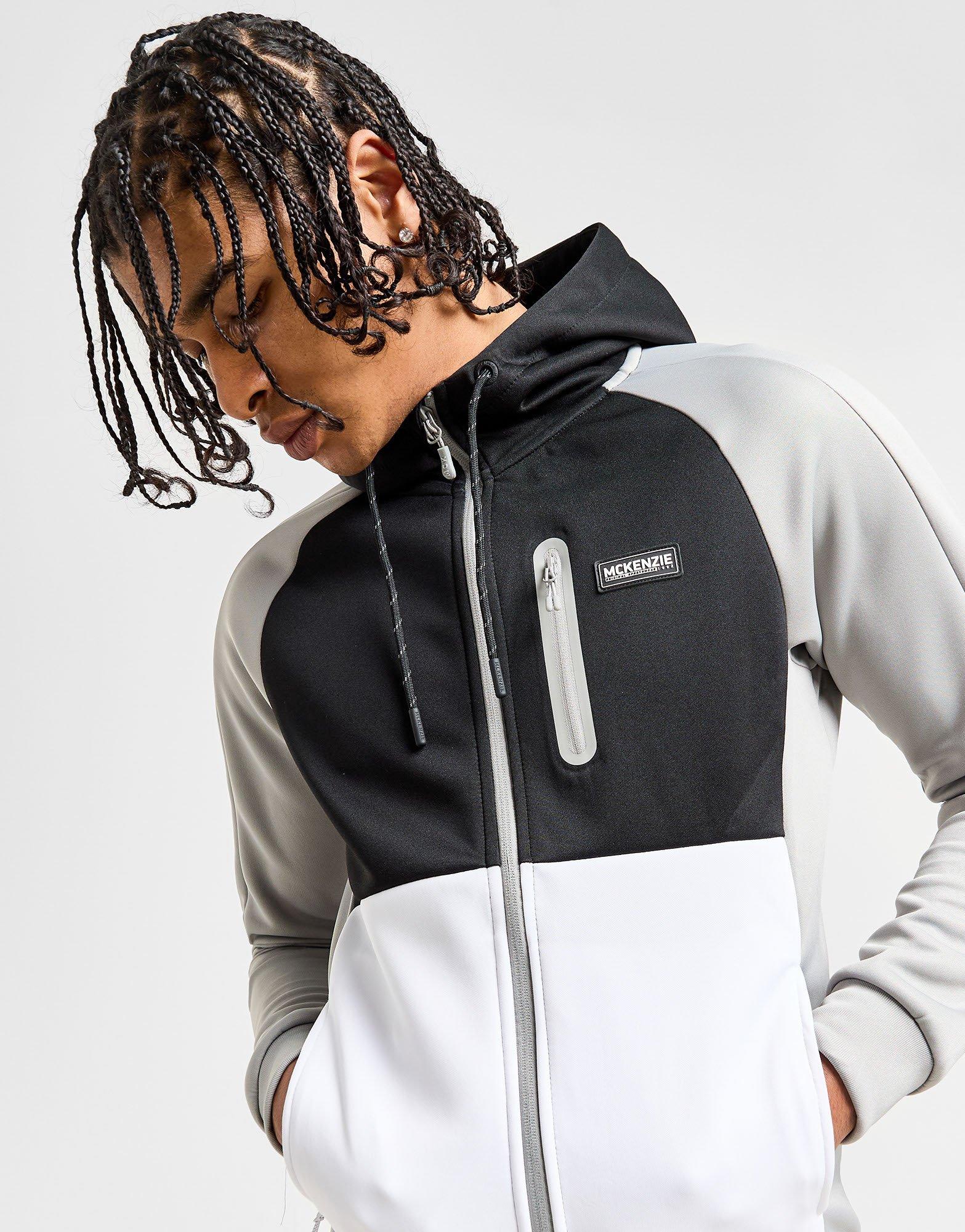 Keep you layer game strong with this men's Base Poly Full-Zip Hoodie from McKenzie. In a Black and Grey colourway, this JD-exclusive hoodie is cut from soft polyester fleece for everyday comfort. It features a full-zip fastening and adjustable hood for custom coverage, with ribbed cuffs to hold the shape. It has side pockets with a zip-up chest pouch for storage and is finished up with signature McKenzie branding. Machine washable | Our model is 6'0" with a 32" chest and wears a size medium.