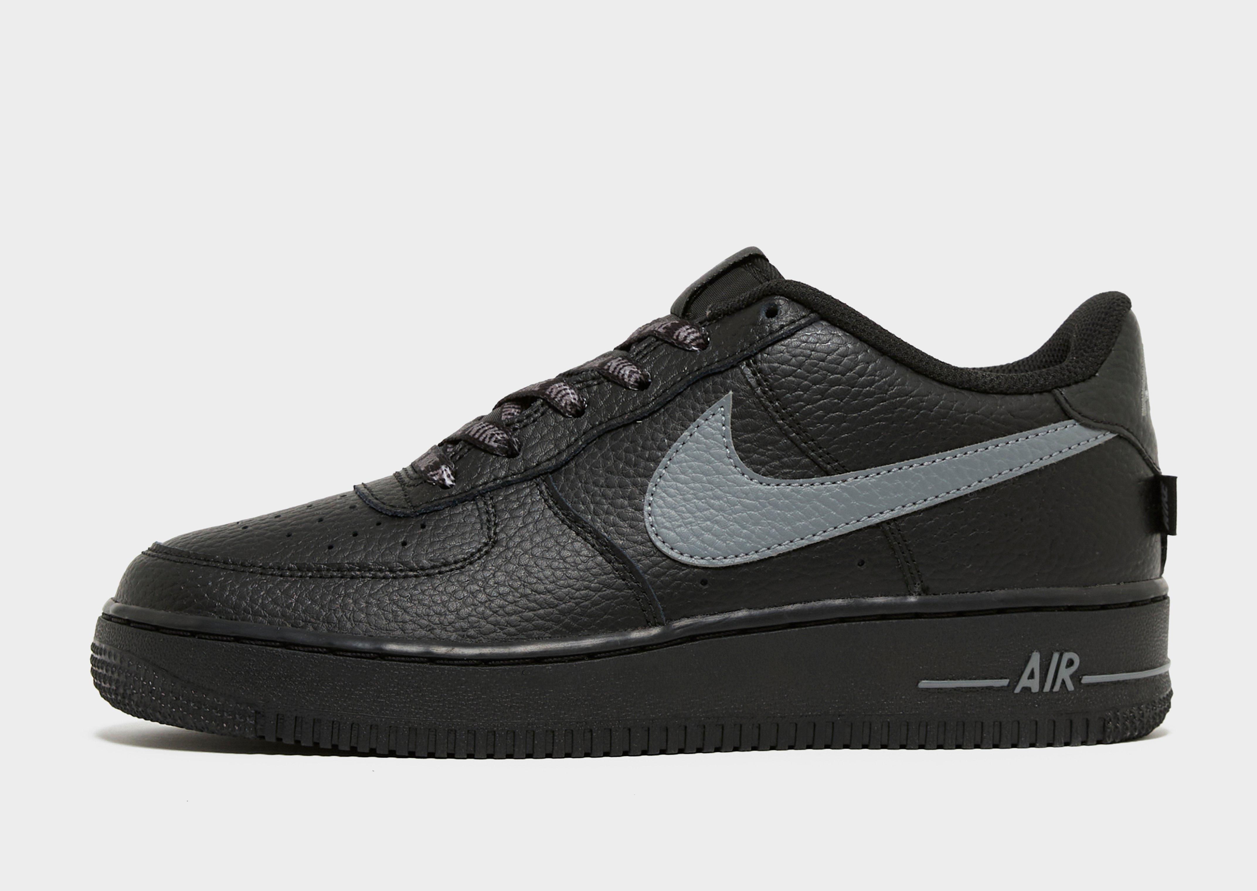 Lace up in signature Swoosh. These juniors' Air Force 1 Low sneakers from Nike are cut from genuine and synthetic leather for lasting wear. They have a padded collar for support. With breathable perforations for ventilation. Underfoot, soft Nike Air cushioning brings a smooth ride. Grippy rubber adds firm traction. They land in black with signature branding in Smoke Grey.