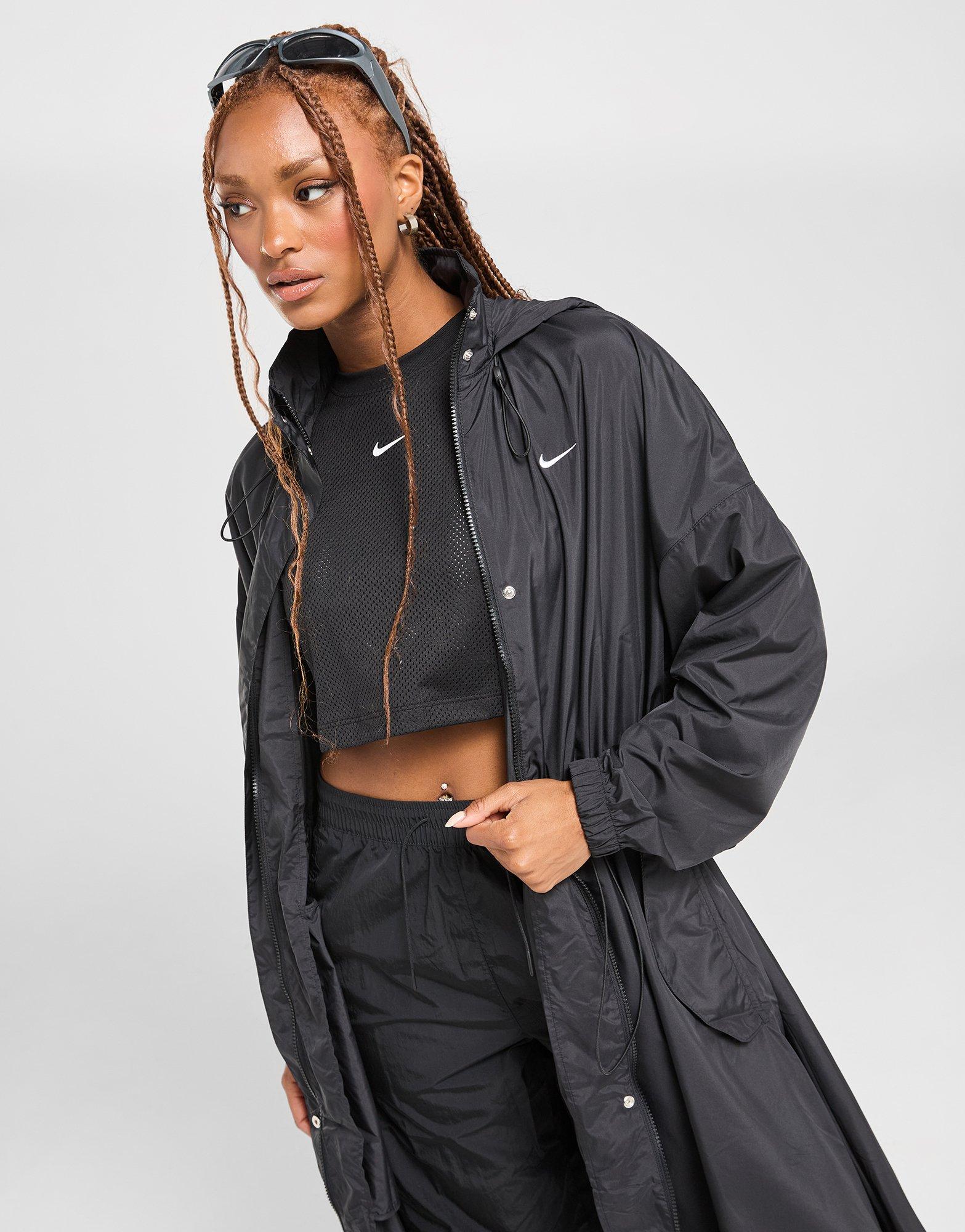 Pull on Nike's take on a classic outer layer with this women's Essential Trench Coat. Landing in a Black colourway, this full zip coat lands by your shins for a longer length and features an adjustable, packable hood, elasticated cuffs and a popper fastening on the front. It's made from lightweight yet durable polyester fabric that provides UVA and UVB protection from the sun. Finished off with spacious side pockets, a mini Swoosh on the chest and an oversized version on the back. Machine washable. | Our model is 5'7" and wears a size small.