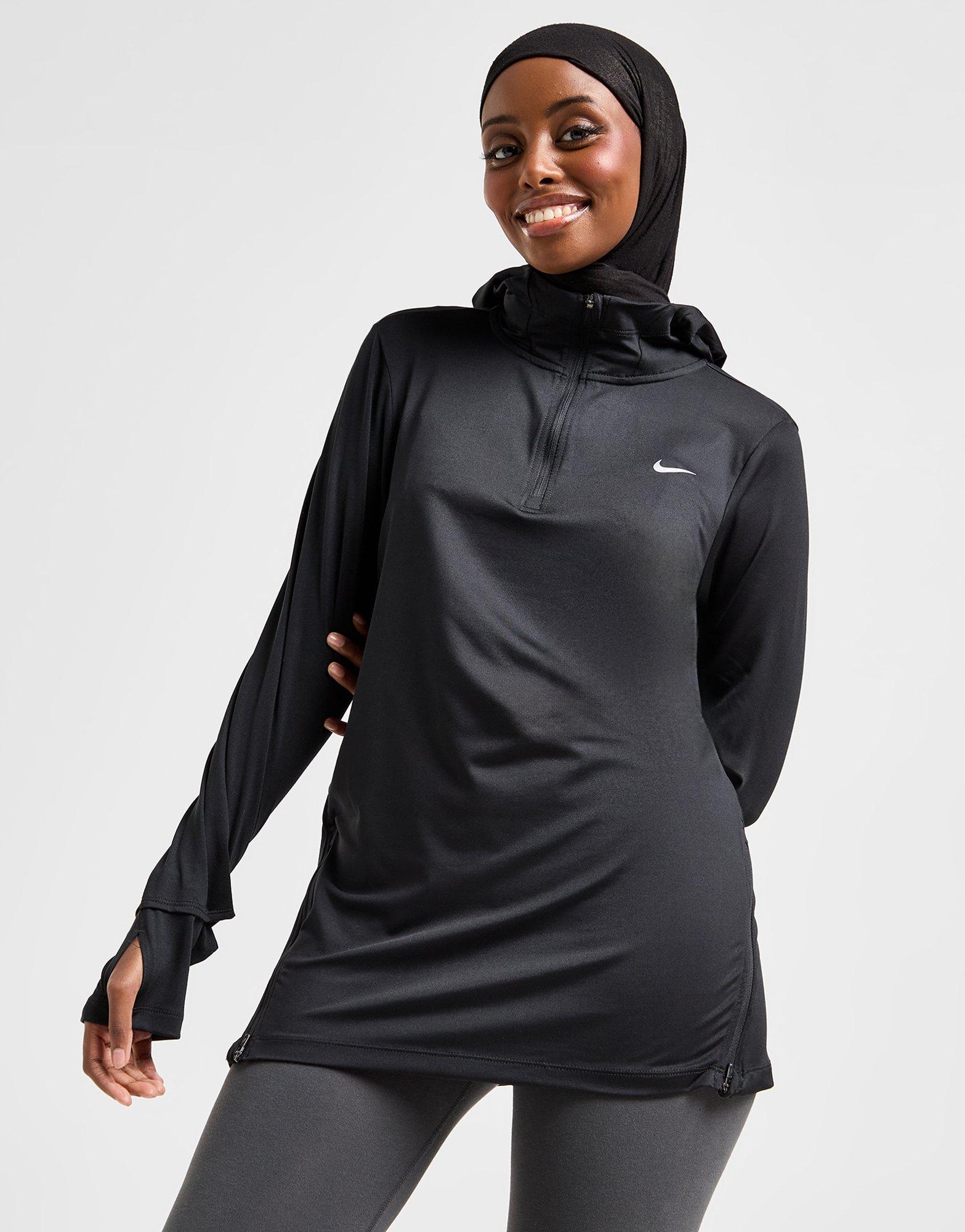 Upgrade your training essentials with this women's Running Modest Swift Hoodie from Nike. In a Black colourway, this standard-fit hoodie is made with smooth, stretch-woven polyester for lasting wear. It's engineered with Nike's sweat-wicking Dri-FIT tech, and delivers UV protection from the sun when you're on the move. It features a quarter zip fastening and a hood to add coverage, with zips at the hem to amp up your airflow. It has thumb loops for a secure, streamlined fit, and a watch window so you can check your device easily. Finished with signature Swoosh branding at the chest. Machine washable.