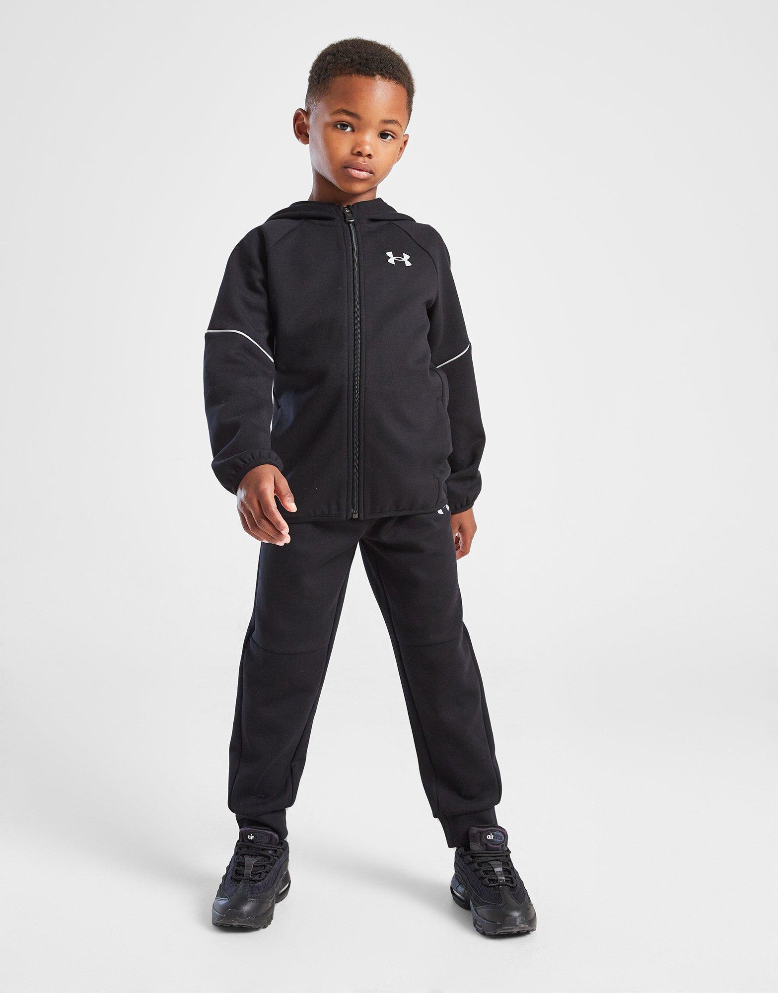 Want them matching? This children's Double Knit Full Zip Tracksuit from Under Armour drops JD-exclusive style on your little one. Reflective branding pops against the black double knit fabric. Stretchy trims add shape to the fit and a zip helps them layer on and off. The hoodie and joggers are finished with signatue Under Armour logos. Machine washable.