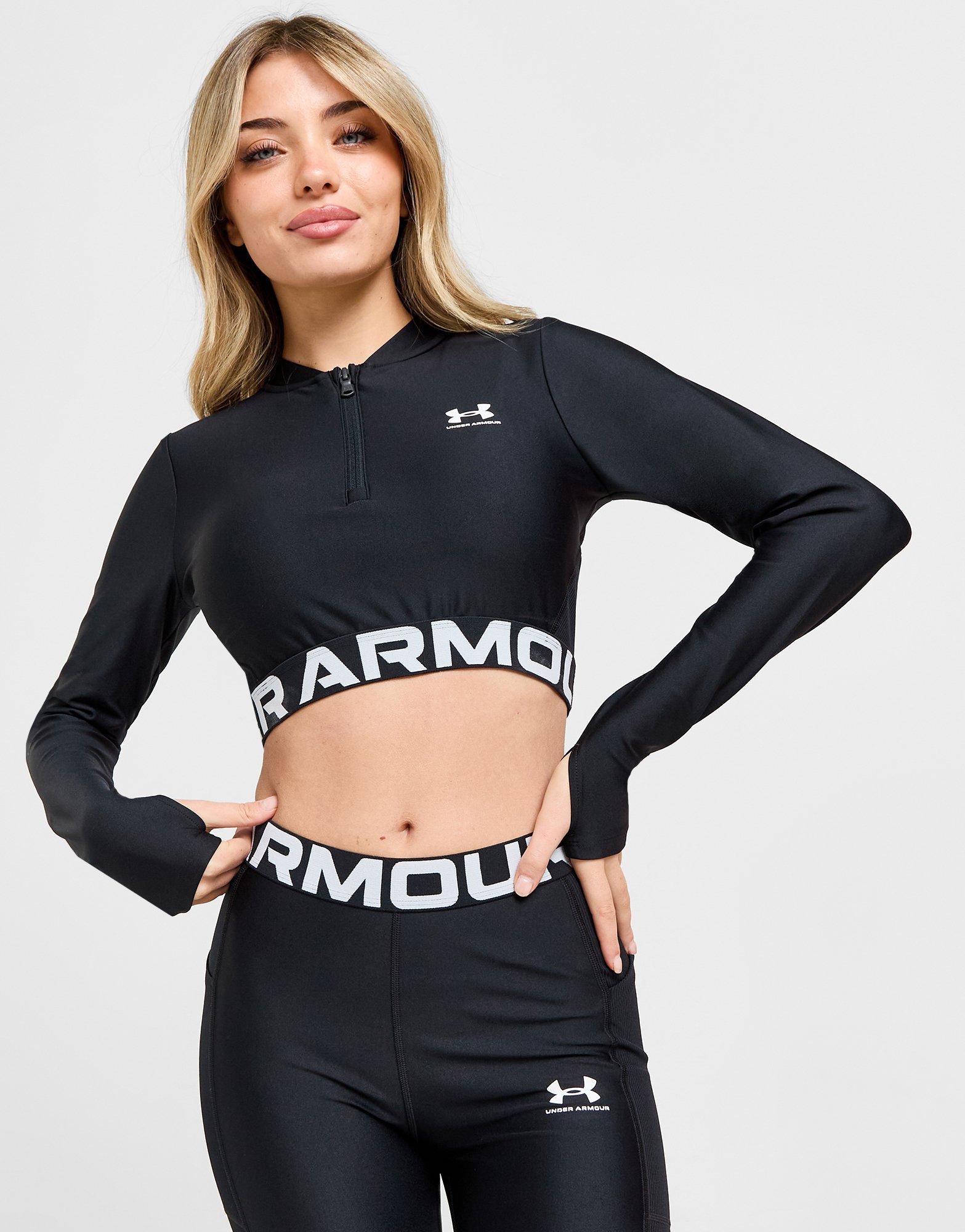 Hit the gym in style with this women's HeatGear Rib 1/4 Zip Top from Under Armour. In a Black colourway, this cropped workout top has a quarter zip collar and built-in thumbholes for adjustable coverage. It's made with 4-way stretch material and equipped with sweat-wicking HeatGear fabric, while stretchy rib panels to the sides and back offer a snug feel. With odour control tech to keep you feeling fresh, it's signed off with Under Armour branding on the elastic underband and the classic logo to the chest. Machine washable. | Our model is 5'6" and wears a size small.