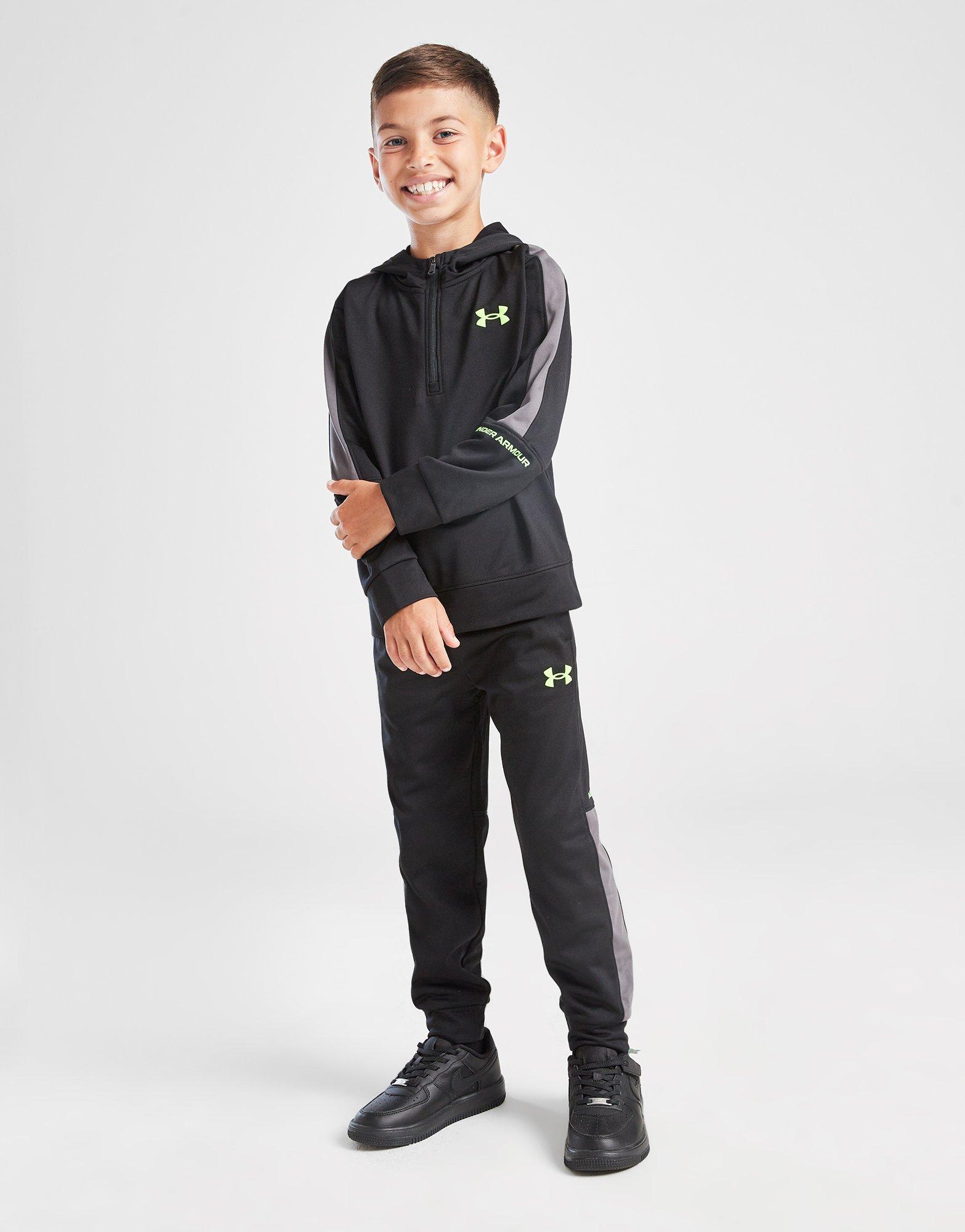 Bring sporty style to their look. This children's Poly Colour Block 1/4 Zip Tracksuit from Under Armour brings the heat. It features a 1/4-zip fastening and hood for custom coverage. The matching pants have an elasticated waistband for a relaxed wear. Ribbed cuffs hold the shape. Side pockets offer safe storage. Finished with signature branding. Machine washable.