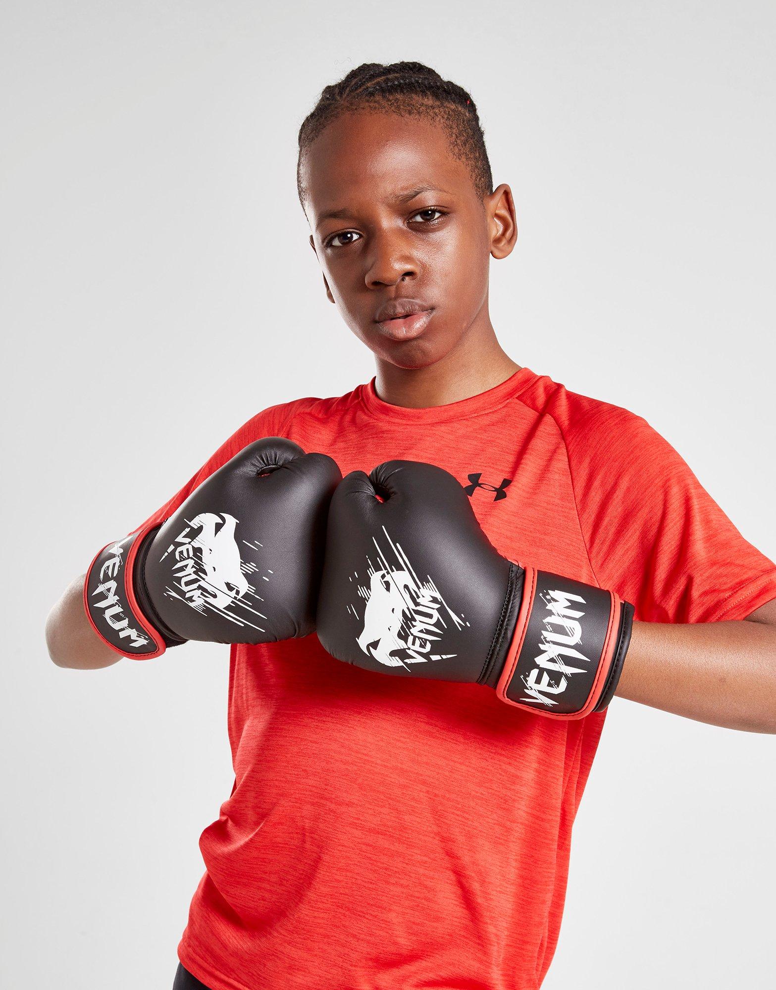 Ideal for an introduction to boxing, these juniors' Contender Boxing Gloves from Venum keep you covered when you train. Made of premium synthetic leather, these boxing gloves have a curved anatomic shape for comfy punching power. Coming with a multi-density foam padding for shock absorbtion and a velcro closure with a wrist support, these gloves are eqipped with an attached thumb minimising the risk of injury. In a black and red colourway, these gloves are finished up with Venum branding. _