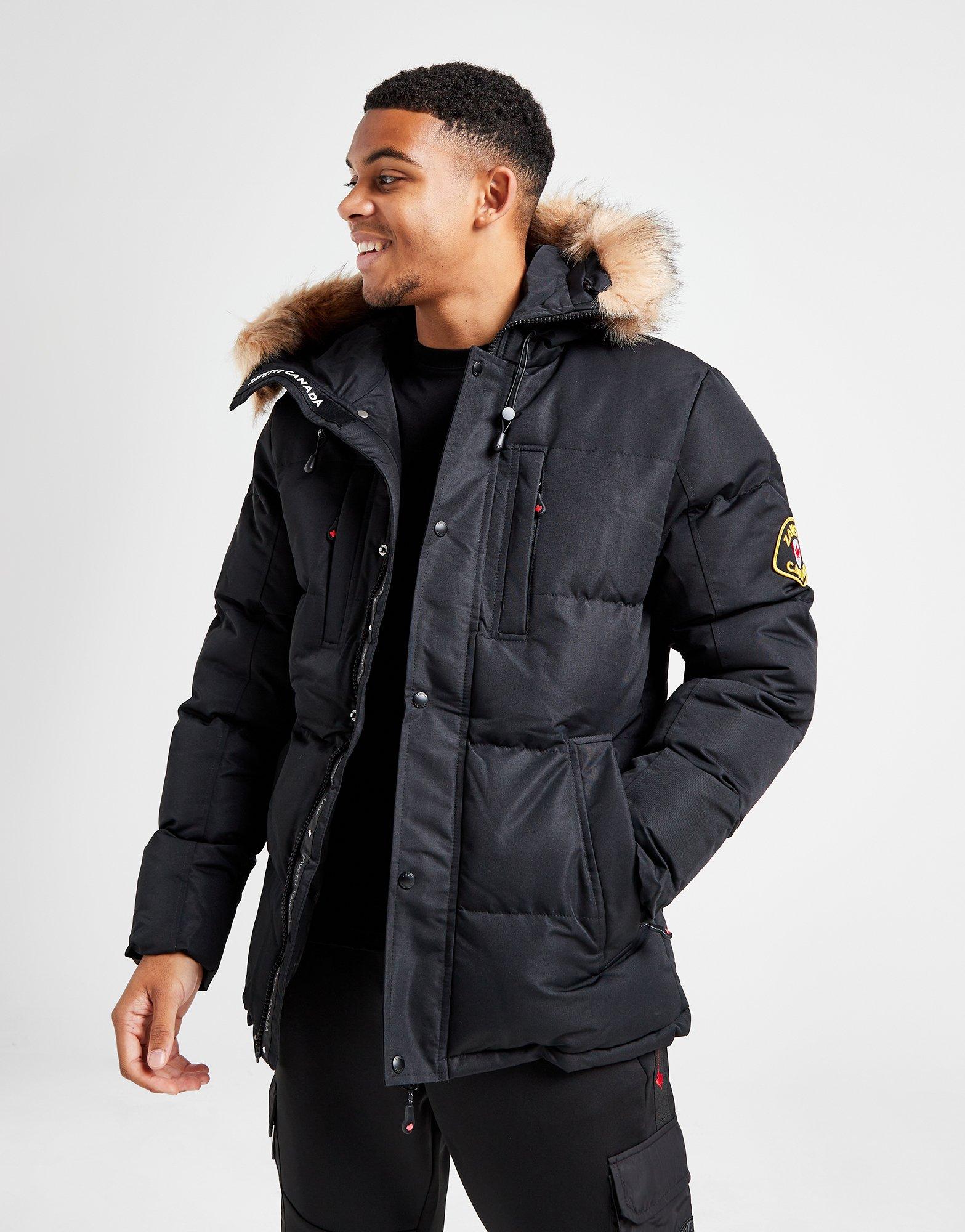 Take on the cold with this men's Oshawa Parka Jacket from Zavetti Canada. In a Black colourway, this jacket is made with smooth, durable woven polyester fabric for lasting wear. It has a lightweight synthetic fill to lock in the heat, and a full-zip fastening with a snap button storm flap. It has a faux fur-trimmed adjustable hood to amp up the coverage, and zipped pockets up front for quick and easy storage. Signed off with a Zavetti branded patch on the sleeve. Machine washable. | Our model is 6'1" with a 39" chest and wears a size medium.