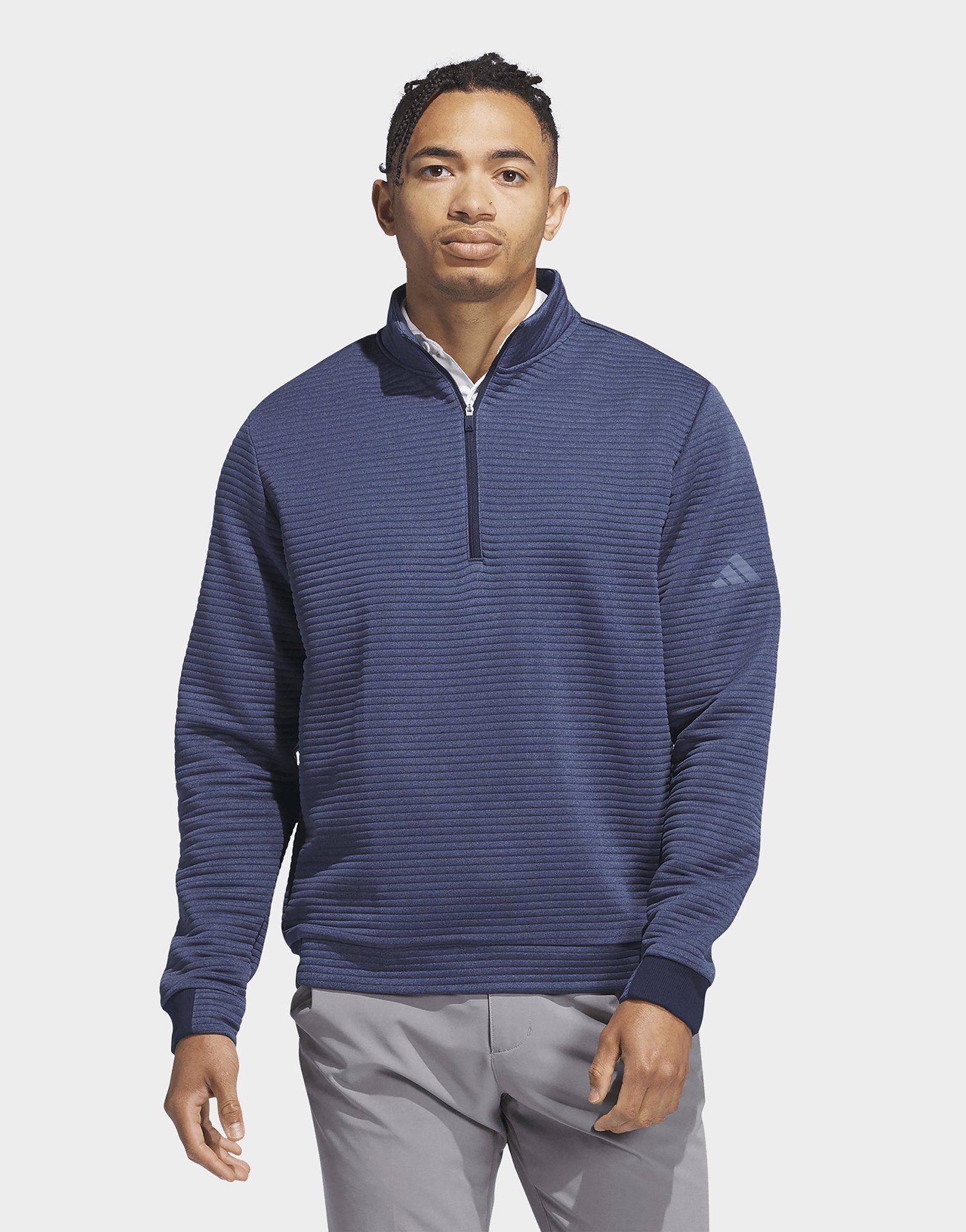 Tee off in cool weather with confidence. This Ultimate365 golf pullover from adidas adds warmth without weighing you down thanks to textured jacquard. Ribbed details add mobility while a water-repellent finish resists moisture to keep you playing through occasional showers. The quarter zip lets you adjust the ventilation as needed.