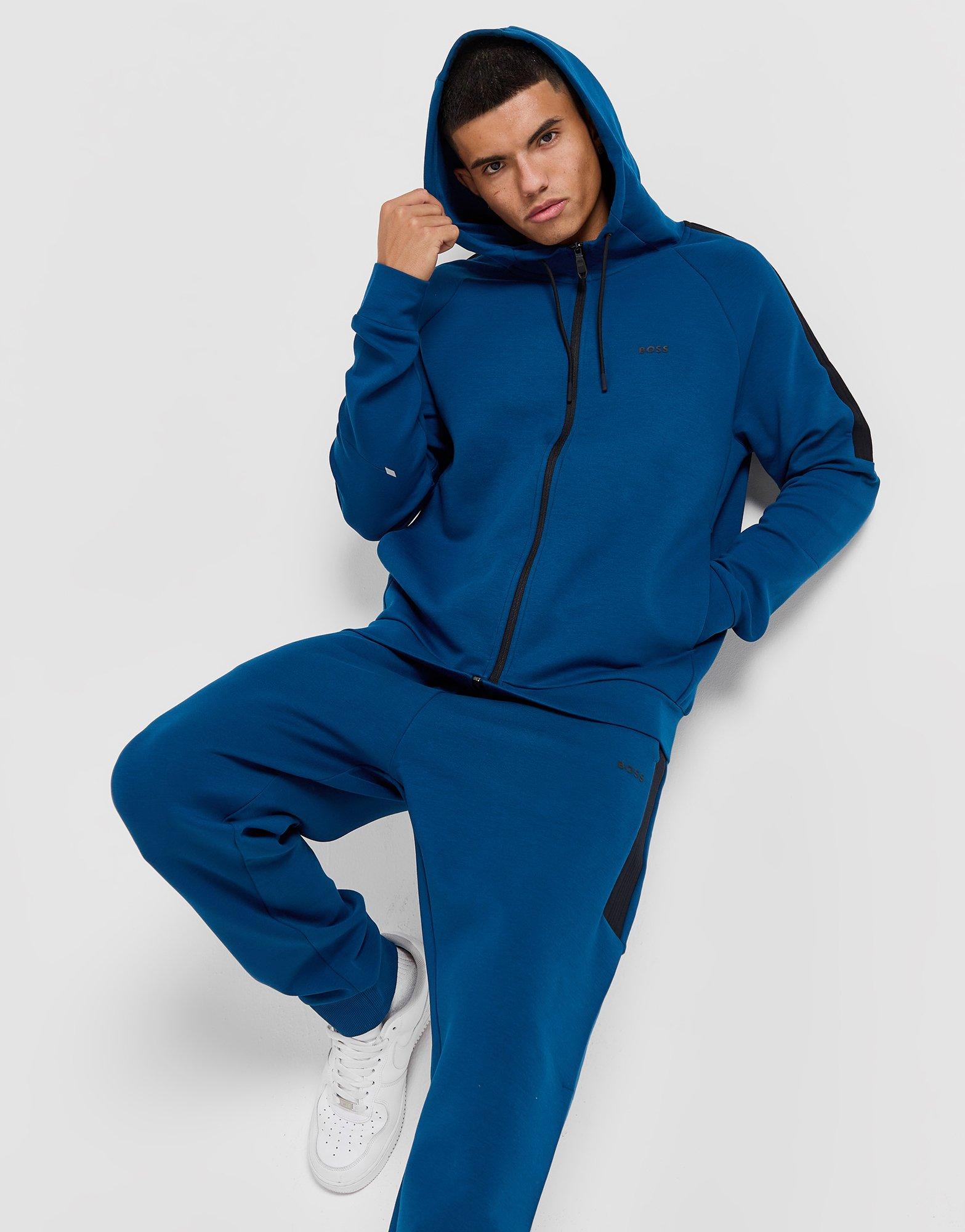 Bring a premium edge to your street-ready 'fits with this men's Full Zip Tracksuit from BOSS. In a Blue colourway, this set is made with a soft, durable cotton-blend with added stretch for supreme comfort. It includes a long-sleeve track top with a full-zip fastening and a drawcord-adjustable hood to amp up the coverage. The matching joggers have an elastic waistband and cuffed ankles for a secure feel, and side pockets to stash your essentials. With clean cut-and-sew inserts, this tracksuit is signed off with BOSS branding at the chest and thigh. Machine washable. | Our model is 6'0" with a 36" chest and wears a size medium.