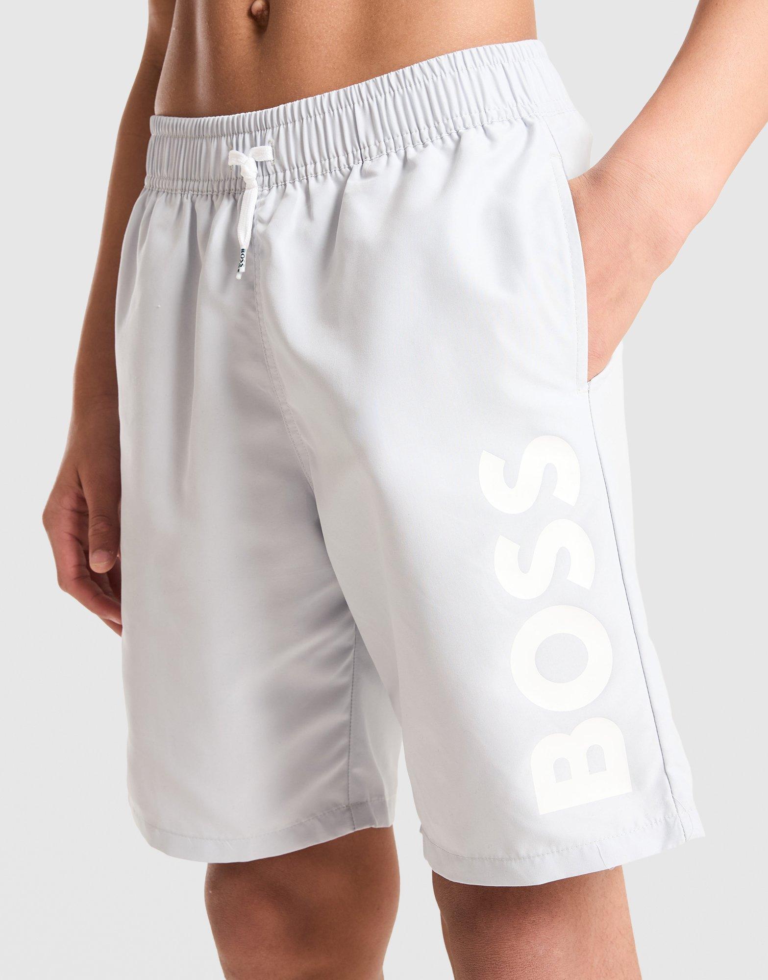 Hit the pool in premium style from BOSS. These juniors' Large Logo Swim Shorts are cut from smooth, lightweight fabric. They've got a drawcord tie on the waist to dial in the fit, with side pockets for storage. Finished with a large BOSS logo at the thigh. Machine washable.
