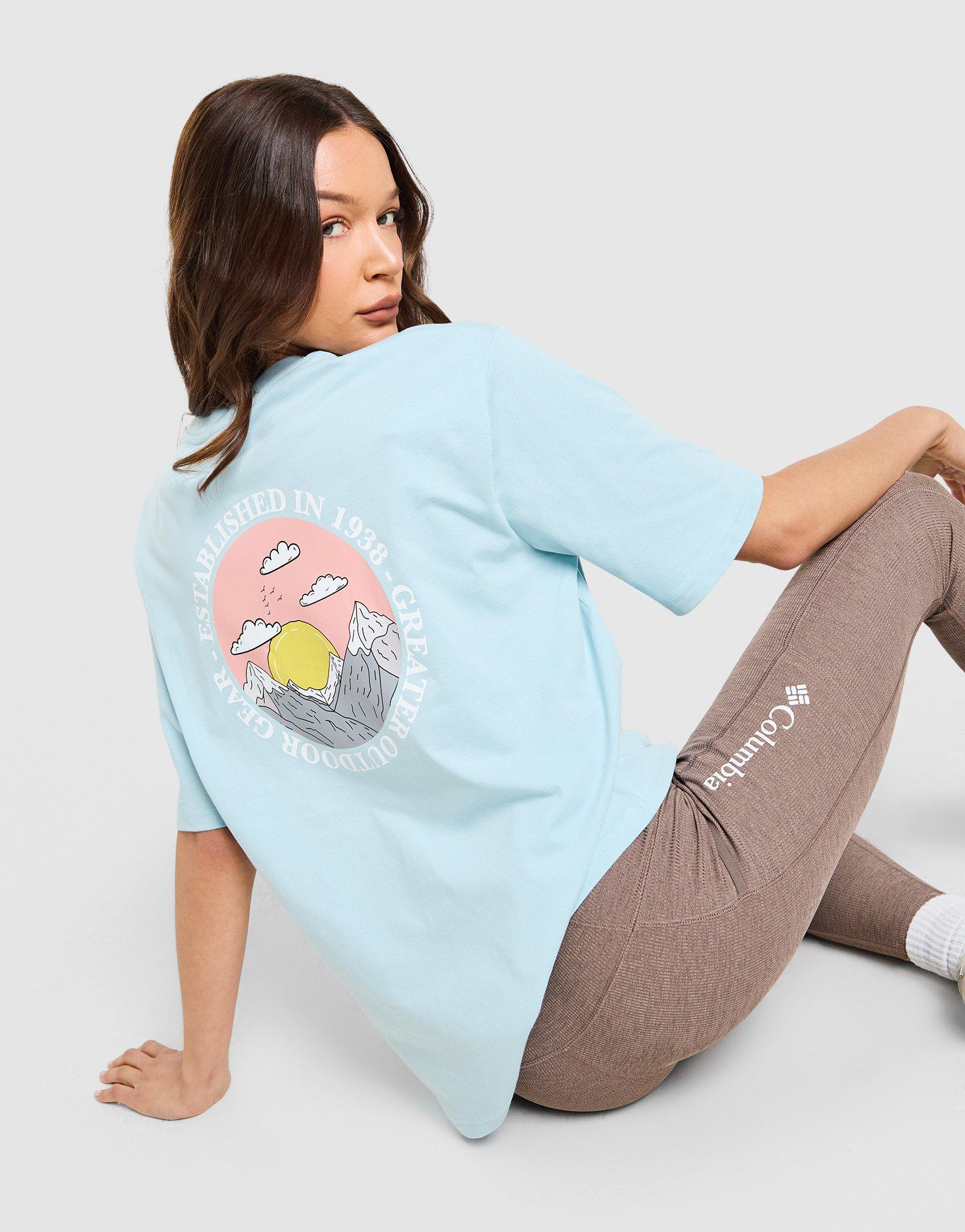 Columbia's coming through with a fresh look for your weekend walks. This women's Skyline T-Shirt lands in blue. It's cut from soft, lightweight cotton for everyday comfort. A ribbed crew neckline and short sleeves pair with a loose fit for a chilled vibe. Finished up with a Columbia branded back graphic and a signature logo to the chest. Machine washable. | Our model is 5'10" and wears a size S.