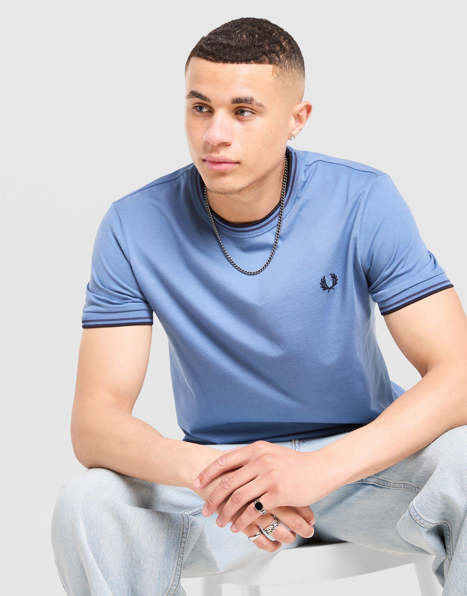 An iconic look, exclusive to JD. Check out this men's Twin Tipped T-Shirt from Fred Perry. In an Ace Blue colourway, this regular-fit tee is made form soft cotton fabric. It has a crew neckline and short sleeves, both with ribbed, twin-tipped trims. Finished with the iconic Laurel Wreath logo embroidered to the chest. Machine washable. | Our model is 6'0" with a 36" chest and wears a size M._