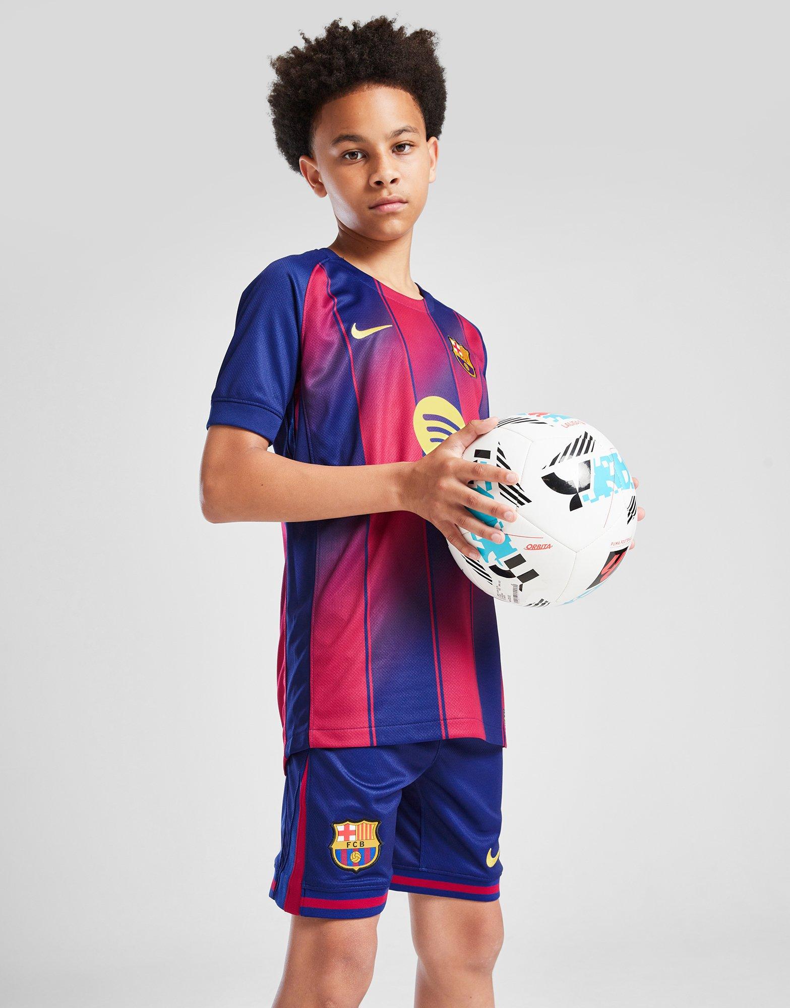 Take on the game repping the Spanish giants with these juniors' FC Barcelona 2025/26 Home Shorts from Nike. In a Deep Royal Blue with Noble Red accents, these stadium shorts are made from lightweight fabric for unrestricted movement. Sweat-wicking Dri-FIT tech keeps you cool and a drawcord tie at the elastic waistband secures the shorts in place. Finished off with a Midwest Gold Swoosh and the signature FC Barcelona badge. Machine washable.