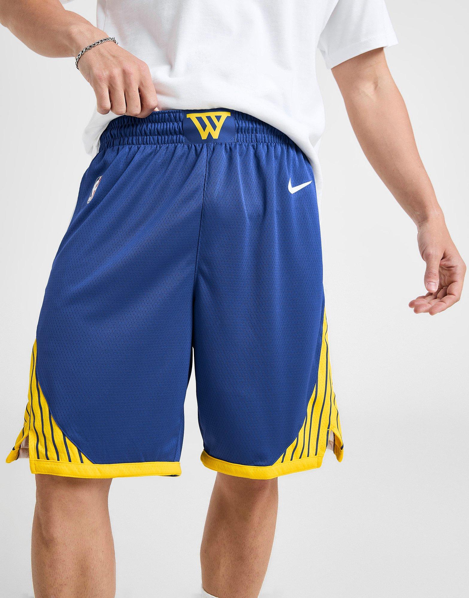 Ball out on the court in these men's NBA Golden State Warriors Swingman Shorts from Nike. In a Rush Blue colourway with Yellow and White accents, these shorts are made from a lightweight double-knit fabric for lasting comfort. They feature an elasticated waistband with a drawcord to adjust the fit, while Dri-FIT sweat-wicking tech keeps you feelin dry. With vents at the side hem for unrestricted movement, they're signed off with Swoosh and NBA branding, with a 'W' logo to rep the Golden State Warriors. Machine washable. | Our model is 6'0" and wears a size M.