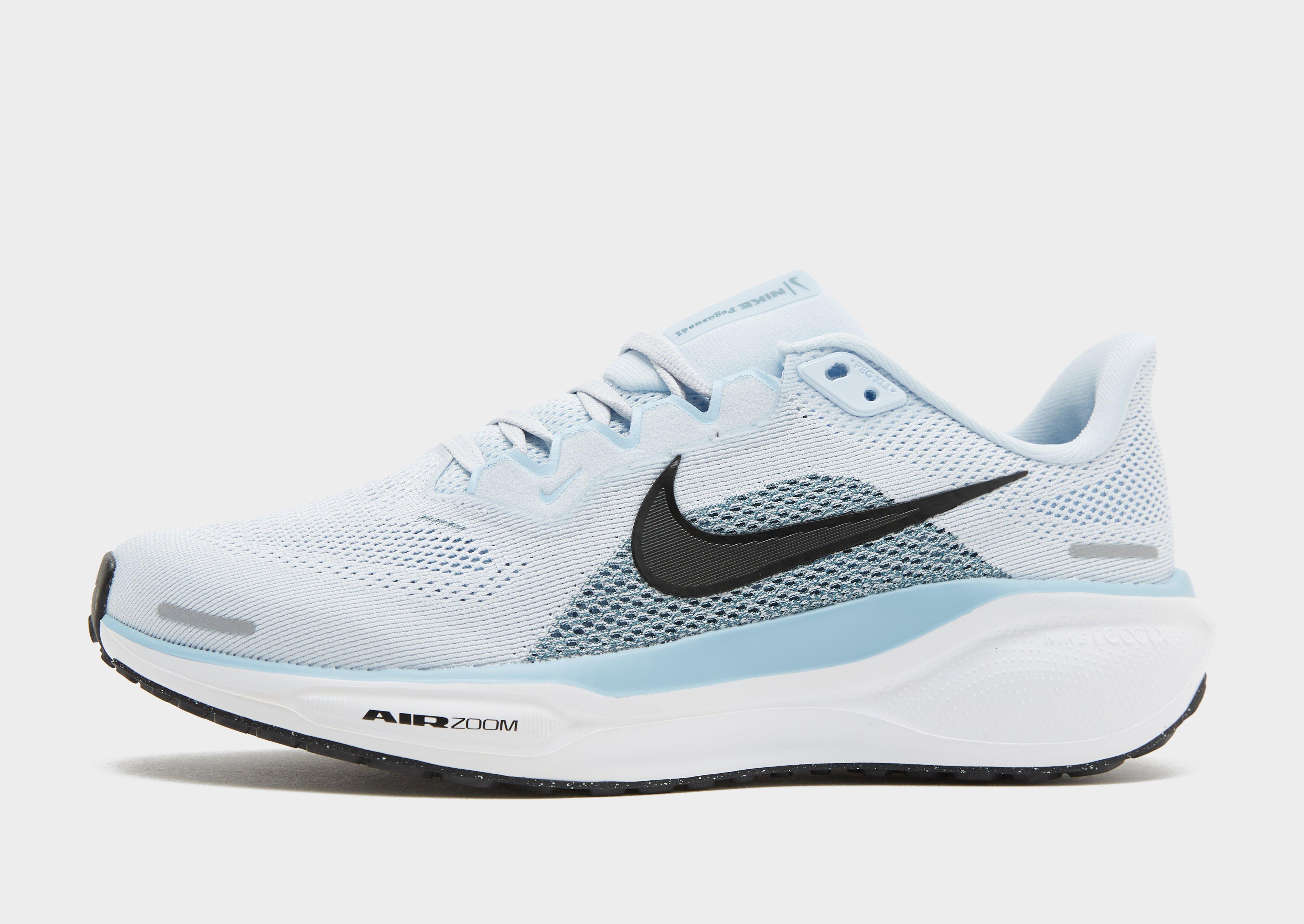 Move fast and go far in these women's Pegasus 41 running shoes from Nike. In a Blue Tint, Psychic Blue and Smokey Blue colourway, these trainers are cut from light and breathable mesh with durable synthetic overlays. They feature a lace fastening to lock you in, with a padded collar for support and sockliner for a snug fit. Underfoot, they sit on a chunky ReactX foam midsole that combines with Air Zoom units in the heel and forefoot for a smooth ride, with a grippy rubber outsole for firm traction. Finished up with signature Swoosh branding.
