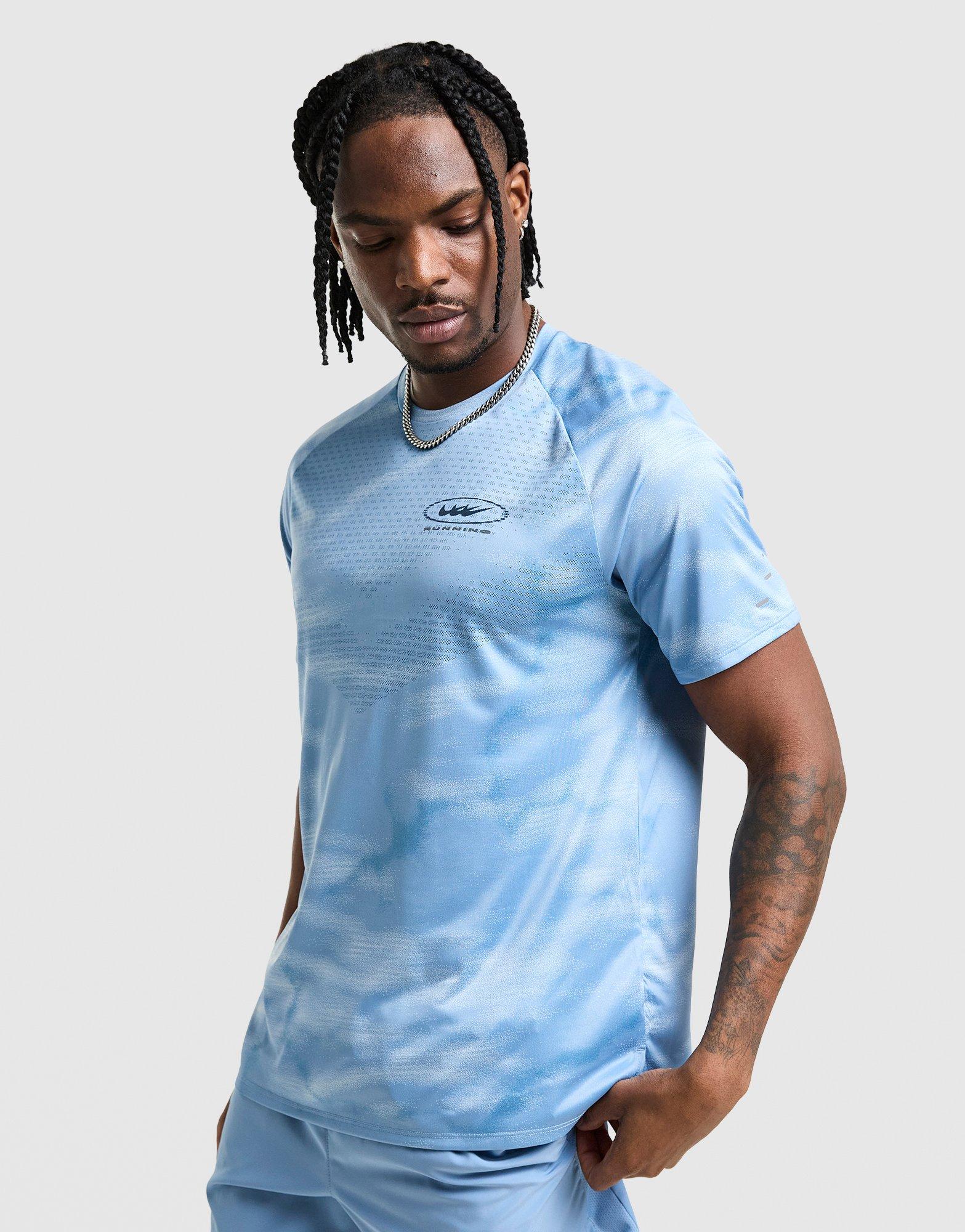 Leave the excuses at the door with this men's Nike Pinnacle Stride T-Shirt. In a mix of blues, this all over print top is made from lightweight fabric. Nike Dri-FIT ADV removes and delivers advanced cooling thanks to breathable zones. Raglan sleeves reduce chafing and feel unrestricted, while the extended hem keeps you covered as you move. Finished off with reflective elements for low light sessions and stacked Swoosh branding. Machine washable. | Our model is 6'0" with a 36" chest and wears a size M.