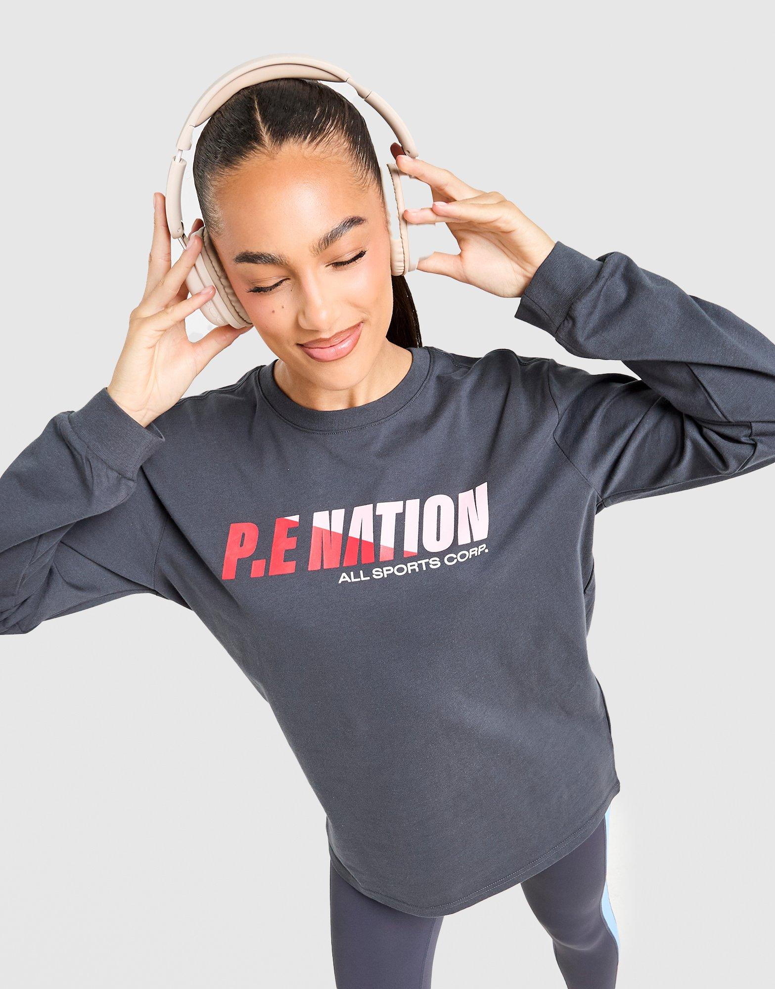 Sports-inspired style for your everyday look. This women's Drill Long Sleeve Top from PE Nation is cut from soft cotton fabric. It features long sleeves with a crew neckline. Ribbed trims hold the shape. It comes oversized for a loose and roomy feel and is signed off with graphic branding to the chest and sleeve. Machine washable | Our model wears a size S.