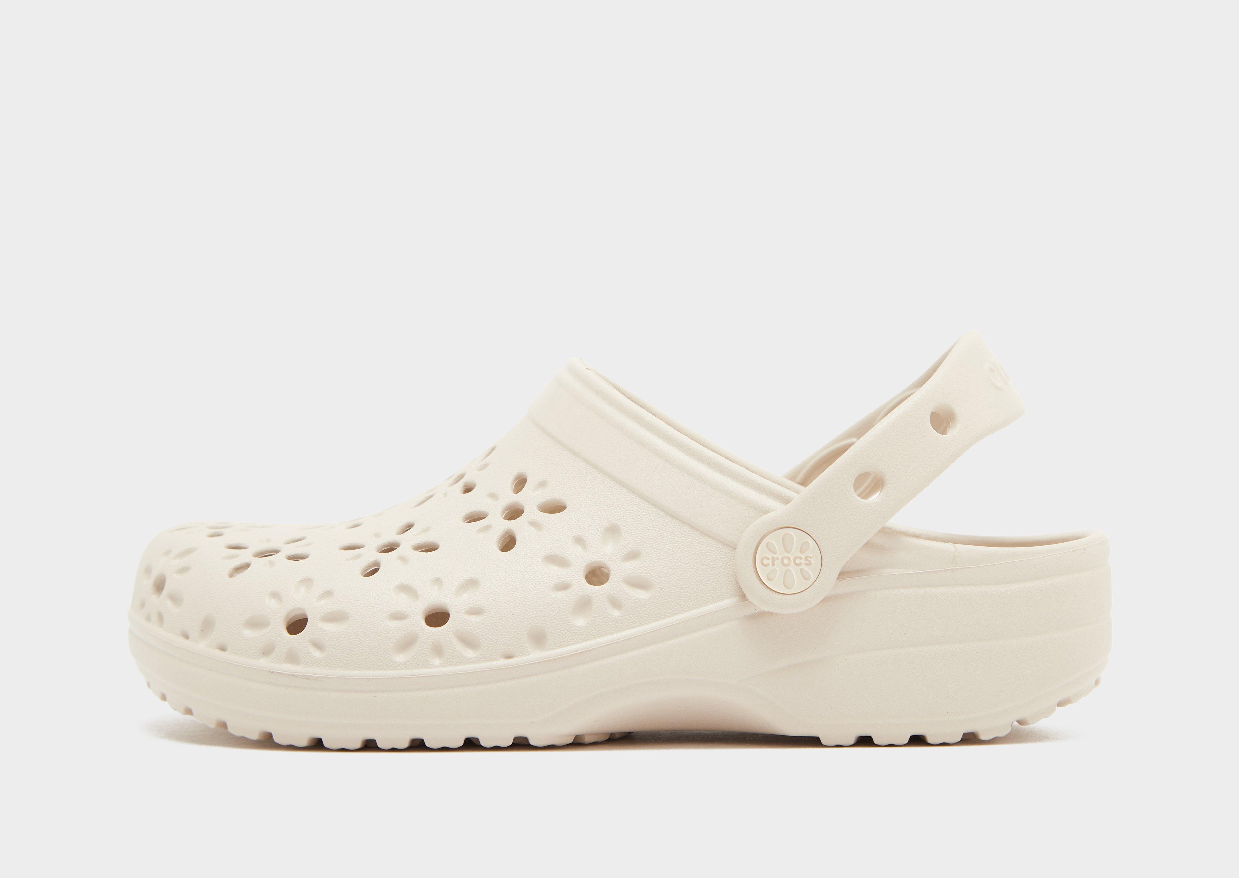 Signature Crocs with a flowery vibe. These juniors' Classic Floral Clogs have a durable Croslite upper. They have a pivoting heel-strap for a custom fit, with breathable holes for ventilation. A textured outsole brings firm traction. Landing in Frappe, they're finished with signature branding. Please note: Crocs fit wide. If you have narrow feet, we recommend that you size down. Crocs come with the US size embossed to the sole.