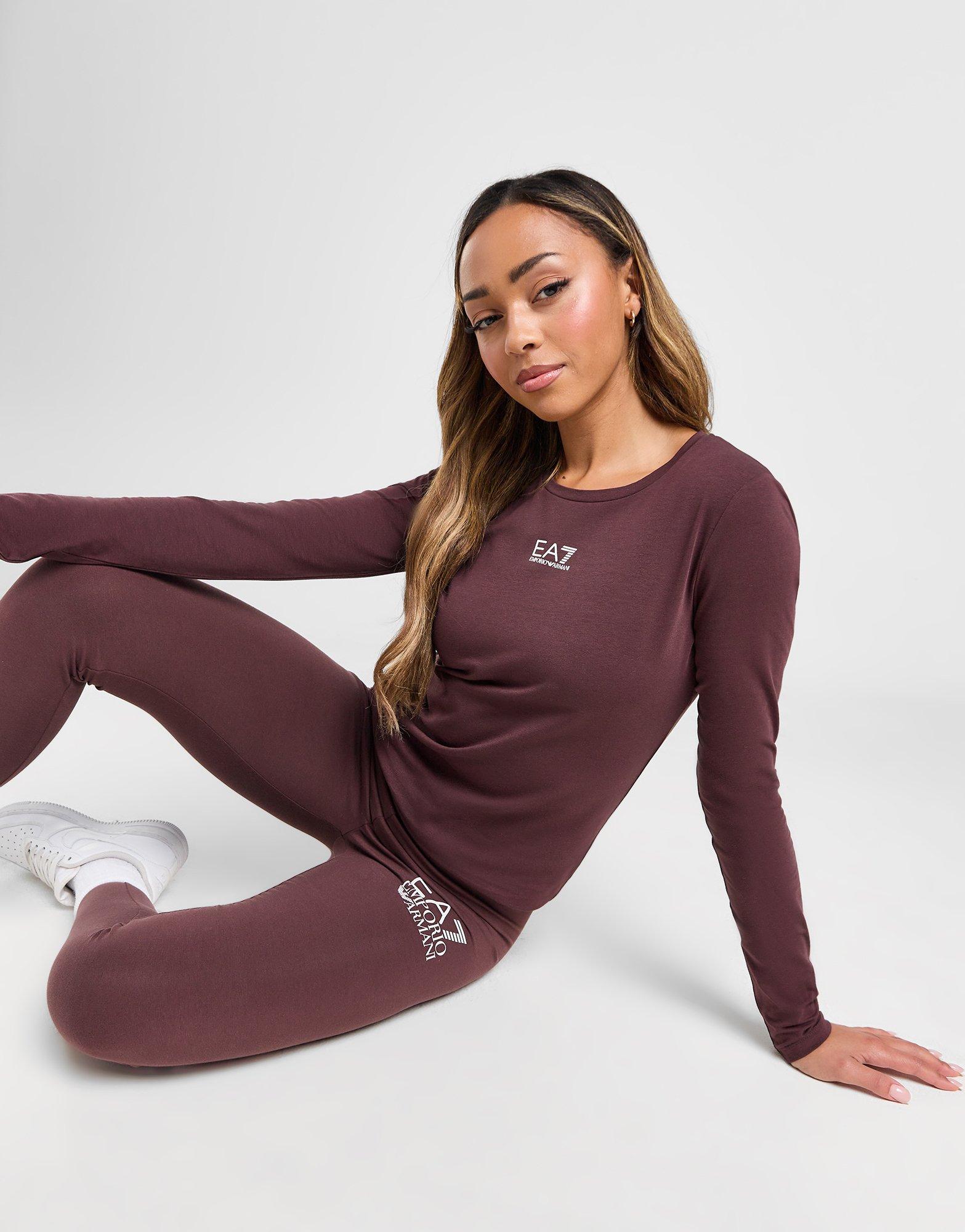 Refresh your everyday staples with this women's Essential Logo T-Shirt from Emporio Armani EA7. In a Dark Brown colourway, this standard fit tee is cut from soft cotton fabric for everyday comfort. It features long sleeves with a ribbed crew neckline and is finished up with classic EA7 branding to the chest. Machine washable | Our model is 5'8" and wears a size small.