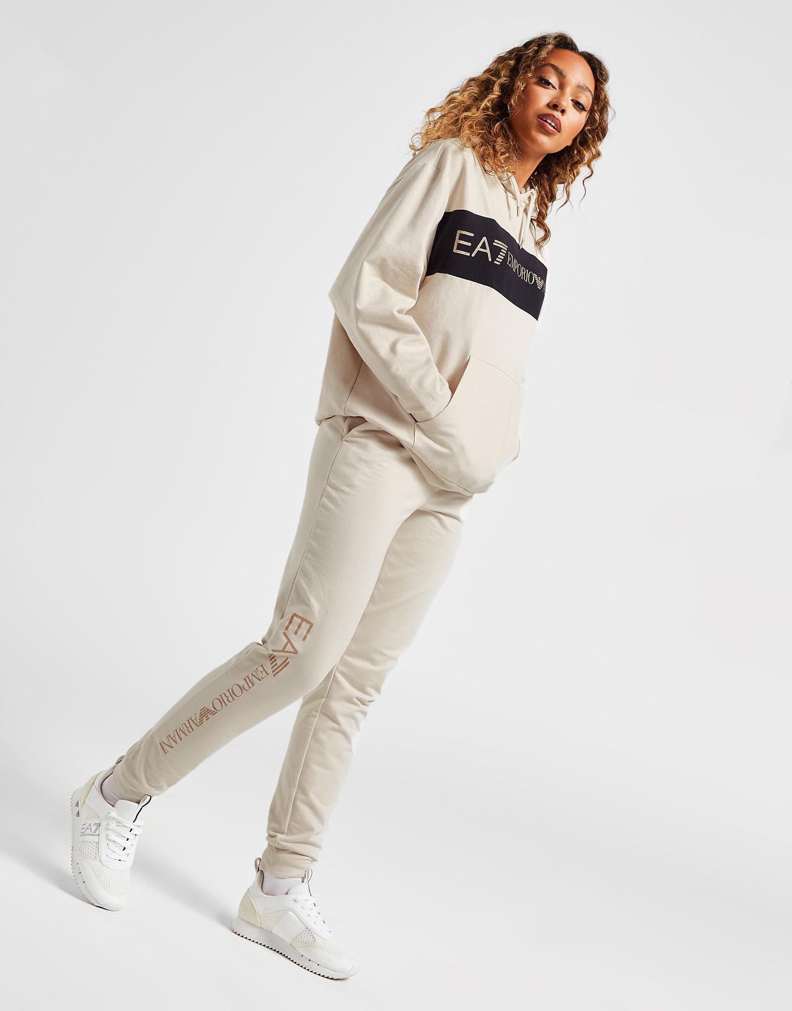Level up your laidback look with these women's Logo Joggers from Emporio Armani EA7. Exclusive to JD, these joggers are cut from a super-soft and breathable cotton fabric for comfy wear throughout the day. Coming in an Off-White colourway with Gold accents, they feature an elastic waistband for supportive wear and have cuffed ankles to optimise the fit. With side pockets for storage, they're signed off with EA7 branding to the thigh and calf. Machine washable. | Our model is 5'8" and wears a size small.