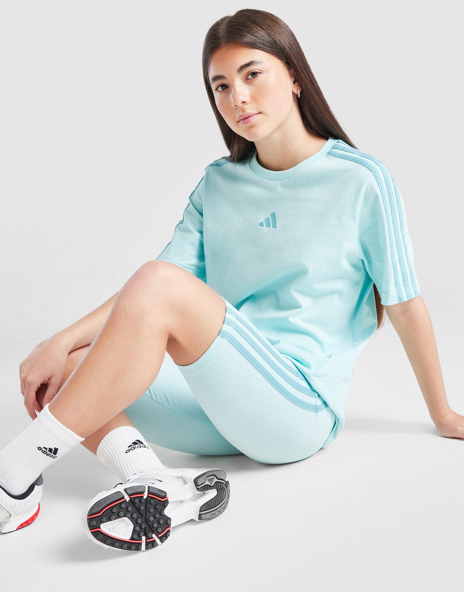Freshen up your everyday rotation with this junior girls' 3-Stripes T-Shirt from adidas. In a Semi Flash Aqua colourway, this JD-exclusive tee is cut from soft, breathable cotton fabric for lasting comfort. It features a ribbed crew neckline and short sleeves for easy wear, and is signed off with the signature 3-Stripes down the sleeves and a Performance logo to the chest. Machine washable. | JV9029