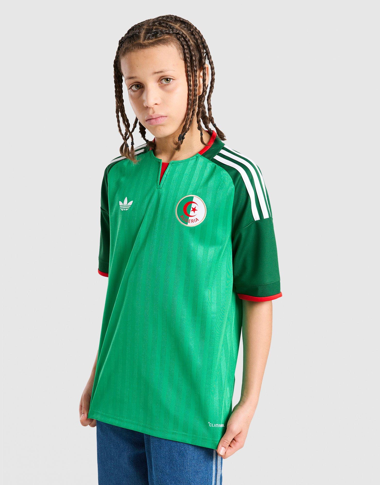 Back your nation on the big stage. This juniors' Algeria 2026 Away Shirt from adidas Originals lands in Court Green with stripes to the front. It's got a crew neckline and short sleeves for a classic look. And don't sweat it, CLIMACOOL tech wicks away moisture when the game heats up. 3-Stripes, a Trefoil logo and the Algeria crest finish things up. Machine washable. | JZ0274