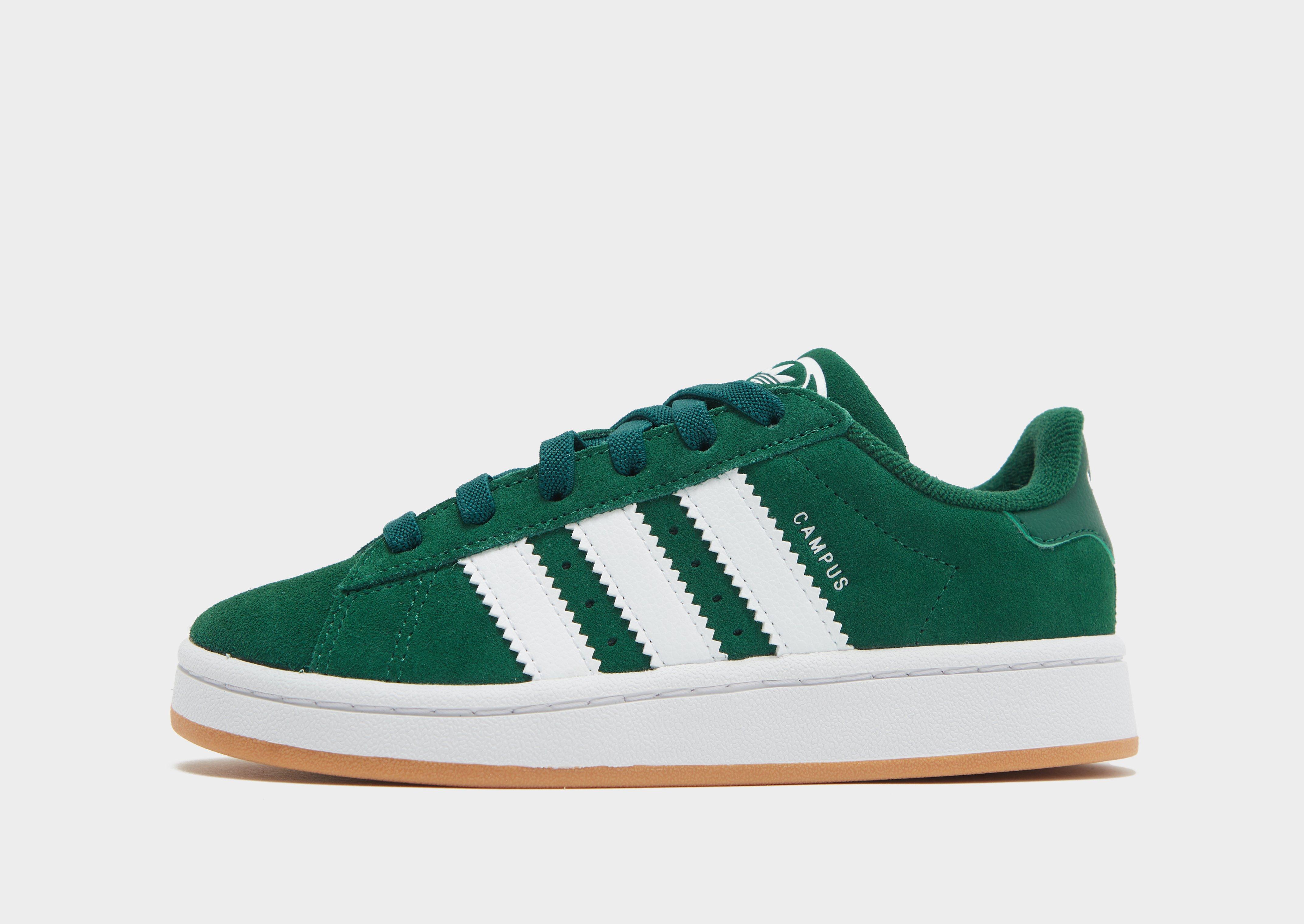 Add a skate-inspired look to their feet with these children's Campus 00s trainers from adidas Originals. In a Dark Green and Cloud White colourway, these downsized kicks have a suede upper and textile lining for a plush look and feel. The padded ankle collar and tongue pair with the elastic laces for an easy fit, while the cushioned insole sits above a Gum rubber outsole for timeless style and grip. Finished off with serrated 3-Stripes on the sidewalls and Trefoil badges to the tongue and heel. | JI4332