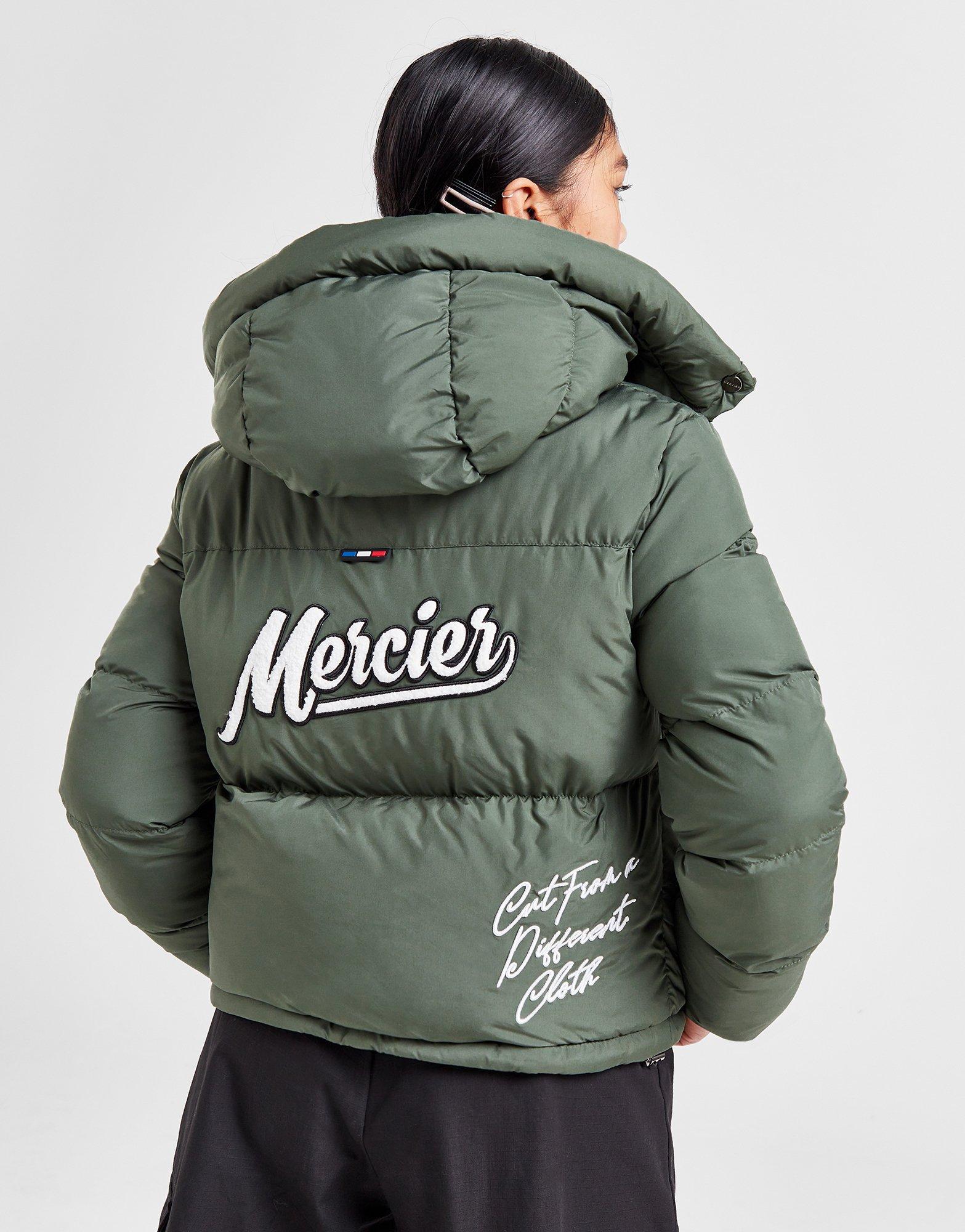 Stay snug this season in this women's Badge Cropped Puffer Jacket from Mercier. In a Khaki colourway, this boxy-fit jacket has a smooth, durable water-resistant shell for lasting wear. It has a full-zip fastening with a detachable hood for custom coverage, and a sleek cropped hem with adjustable bungee cords. It has front pockets to store the essentials with ribbed cuffs for a secure fit, and is signed off with bold Mercier branding throughout. | Our model is 5'3" and wears a size small.