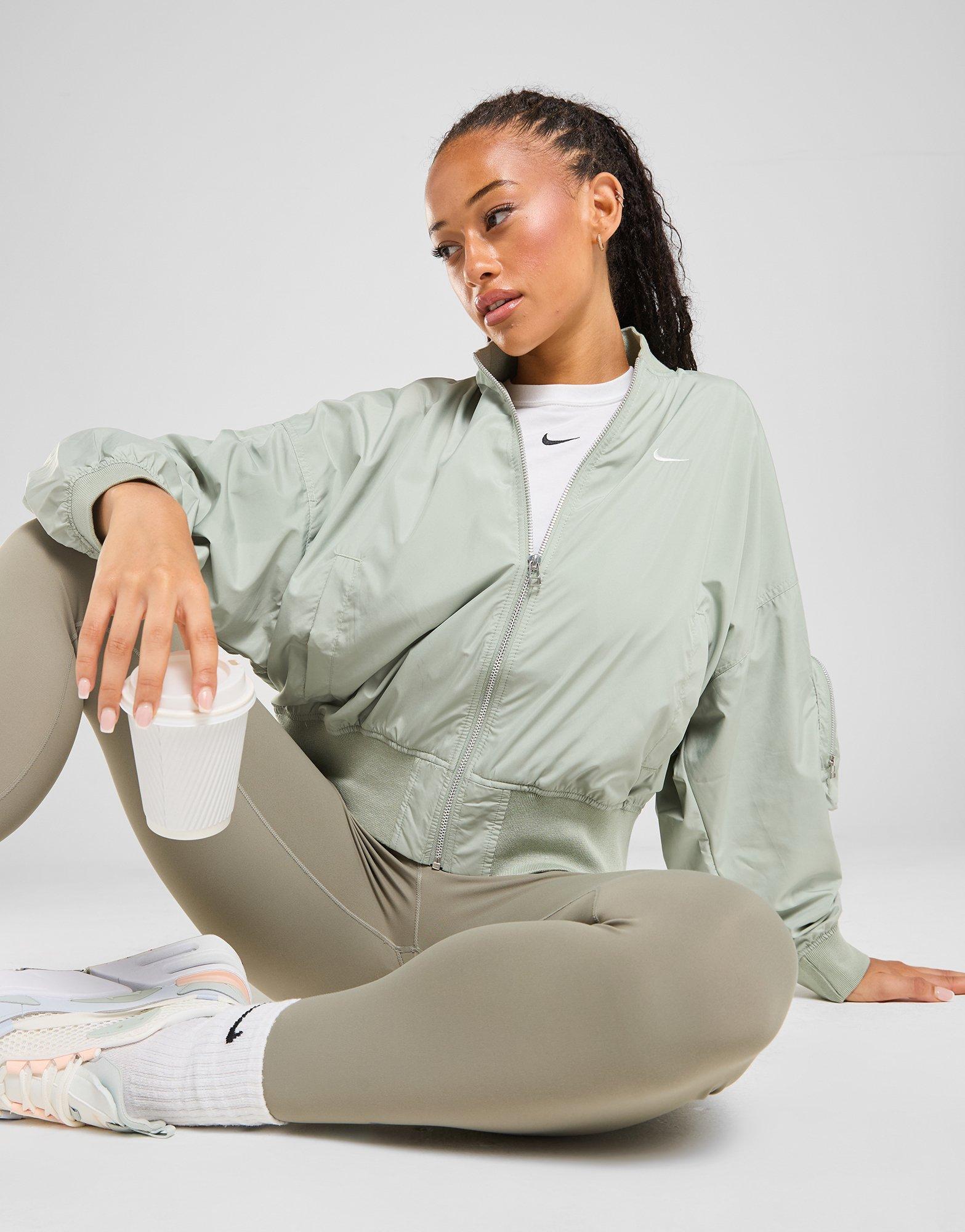 Pull on a classic vibe with this women's Sportswear Essential Oversized Bomber Jacket from Nike. In a Jade Horizon, this full zip jacekt has dropped shoulders, a blade collar and ribbed trims that tie it all together. It features a mesh lining and has UVA and UVB protection to the poly fabric to keep you fresh when the sun hits. With a zip-fasten pocket to the left sleeve, this jacket is finished off with side pockets and the Swoosh to the chest. Machine washable. | Our model is 5'8.5" and wears a size small.
