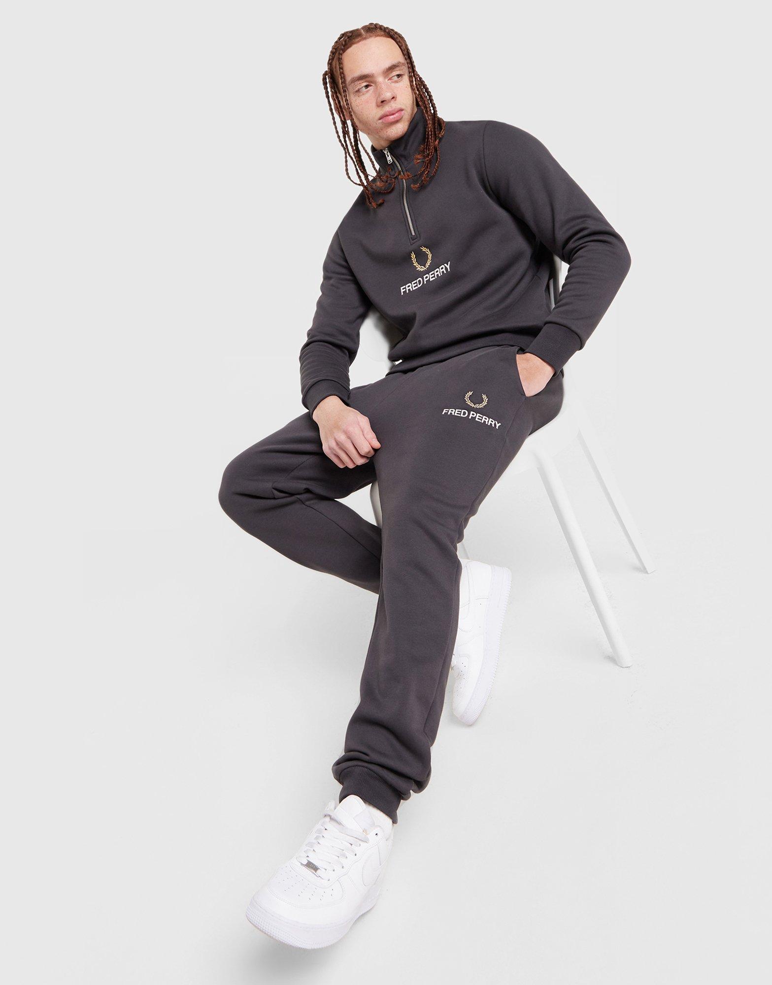 Fred Perry gets a JD-exclusive edit with these men's OG Stack Joggers. In Asphalt, the soft cotton fleece is brushed for a warm feel and premium look. The relaxed shape has a drawcord tie to cinch in the waistband and cuffed ankles to taper the legs. Finished off with side pockets and stacked Fred Perry Laurel Wreath branding. Machine washable. | Our model is 6'0" and wears a size M.