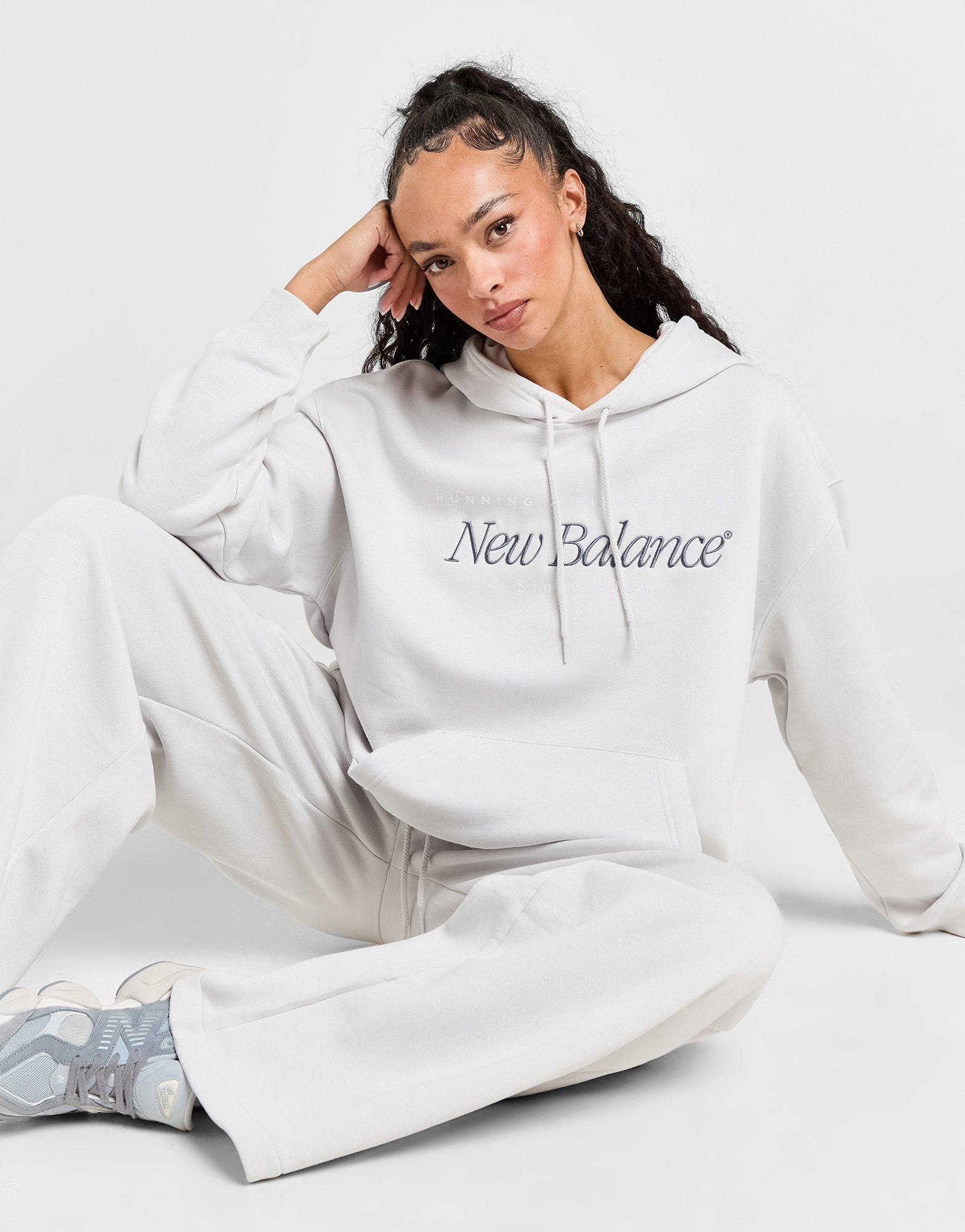 Kick back in essential comfort with this women's Double Script Hoodie from New Balance. In a Grey Matter colourway, this JD-exclusive hoodie is cut from soft fleece fabric for total comfort. It features a pullover, adjustable hood for custom coverage, with ribbed trims to hold the shape and a kangaroo pouch for easy storage. Finished up with script branding embroidered to the chest. Machine washable | Our model is 5'8" and wears a size small.