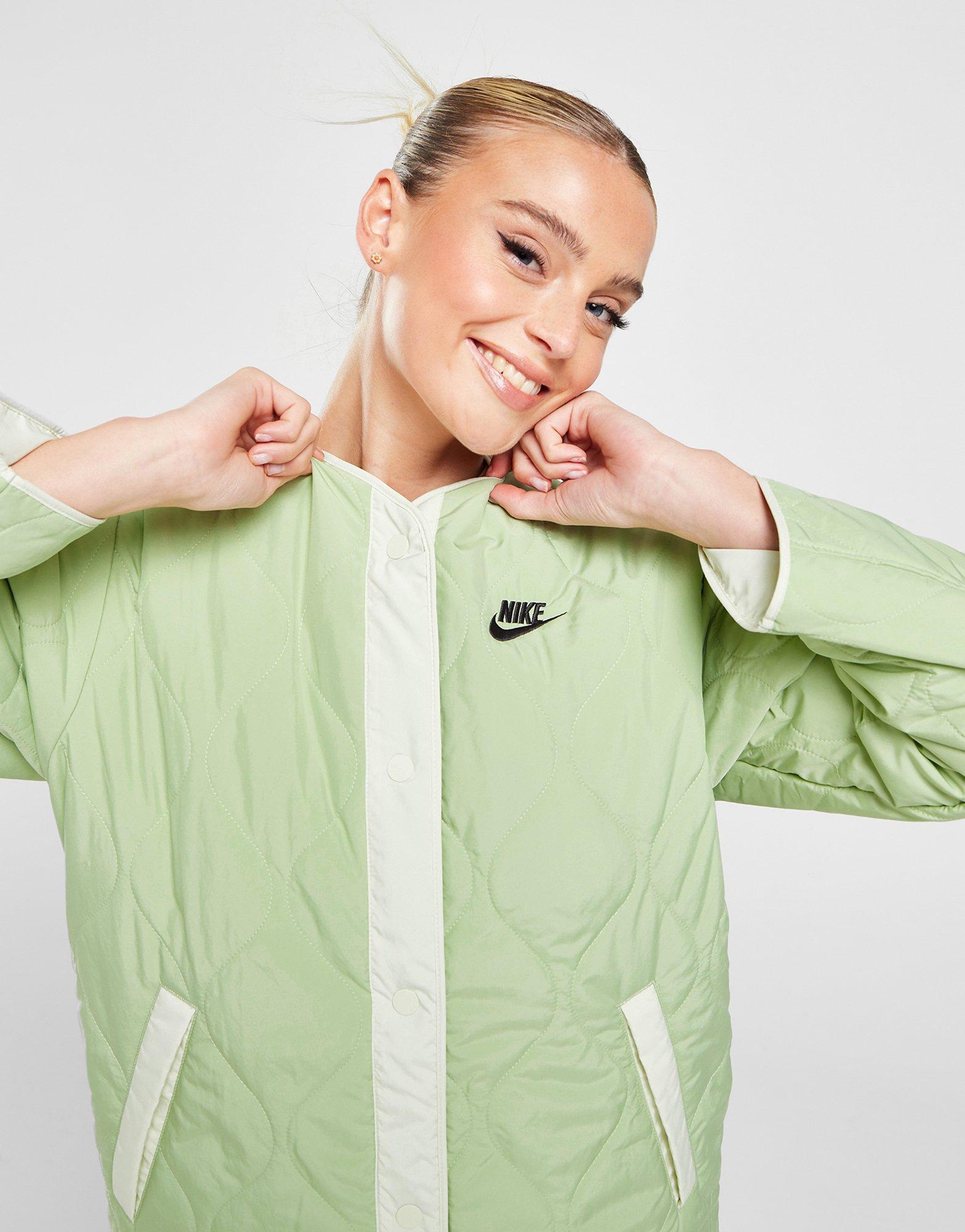 Throw on a layer when the temps drops with this women's Utility Jacket from Nike. In a Honeydew and Sea Glass colourway, this standard fit jacket is cut from smooth, lightweight polyester, with synthetic fill in the quilting for extra warmth. It has built-in Therma-FIT tech that regulates your body heat, while the front, snap-button closure brings adjustable coverage. It has side pockets for storage and is finished up with Nike branding to the chest. Machine washable | Our model is 5'9" and wears a size small.