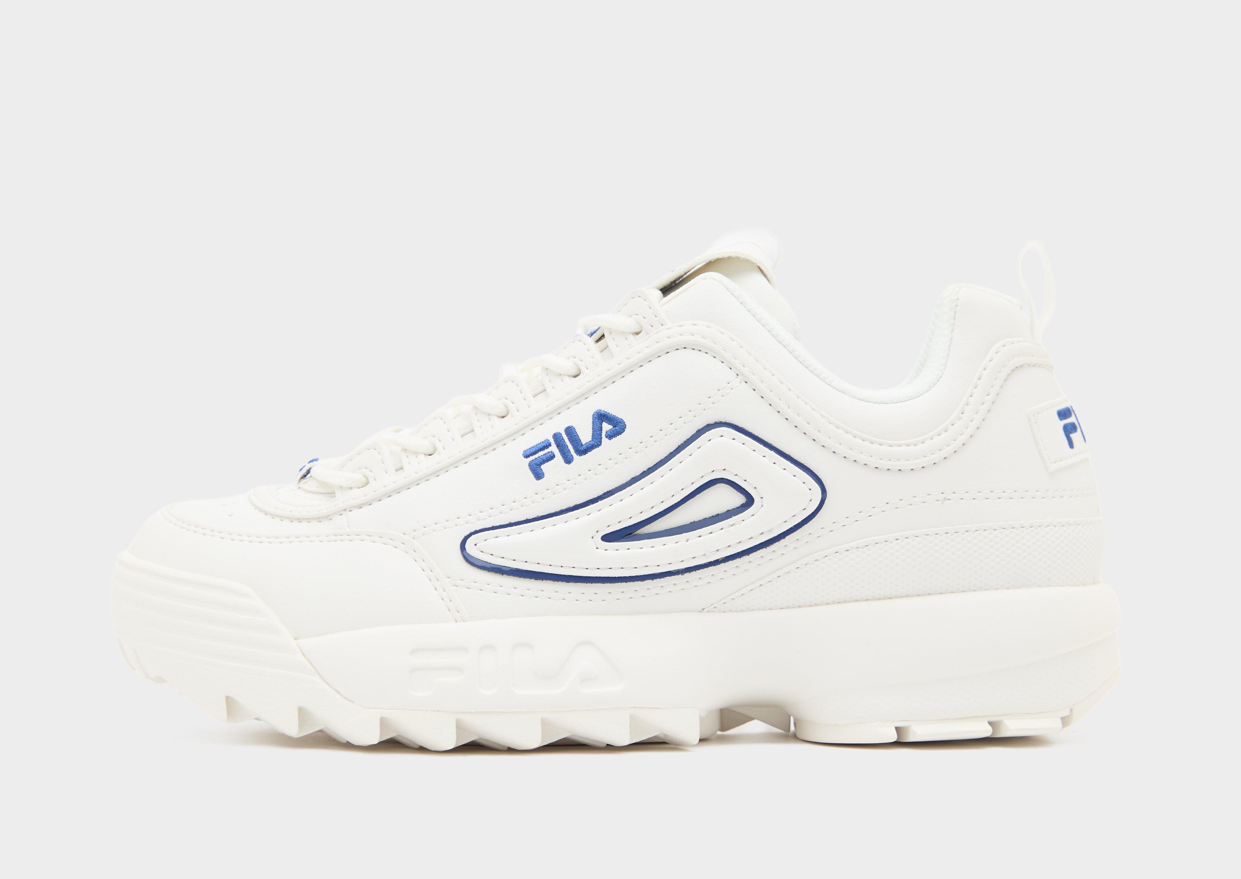Retro energy hits from Fila with these juniors' Disruptor 2 sneakers. Only at JD, these off-white trainers have a chunky foam midsole for added height and cushioning. Sawtooth rubber lugs bring big traction and attitude to every step. Finished with a layered synthetic upper and contrast Fila branding.