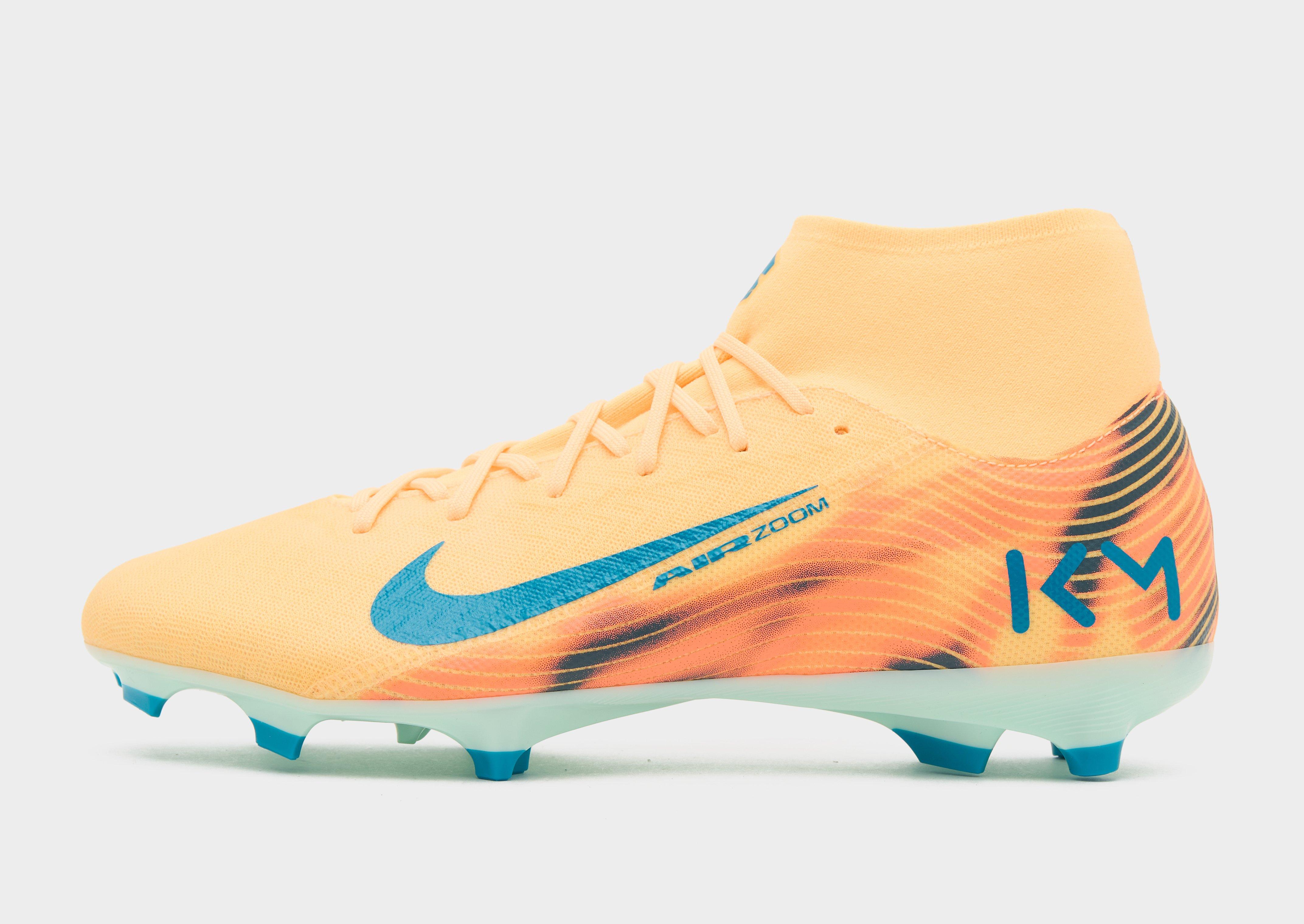 Made for pace. These men's Mercurial Superfly 10 Academy FG football boots from Nike land in Melon Tint and Neon Turquoise. Up top, NikeSkin uses embedded chevrons for better ball control. They've got a Dynamic Fit collar for support. And an Air Zoom to give you a boost of pace. Below, a wave-like pattern of studs keeps you gripped on the pitch. Nike and Kylian Mbappe branding finishes things up.