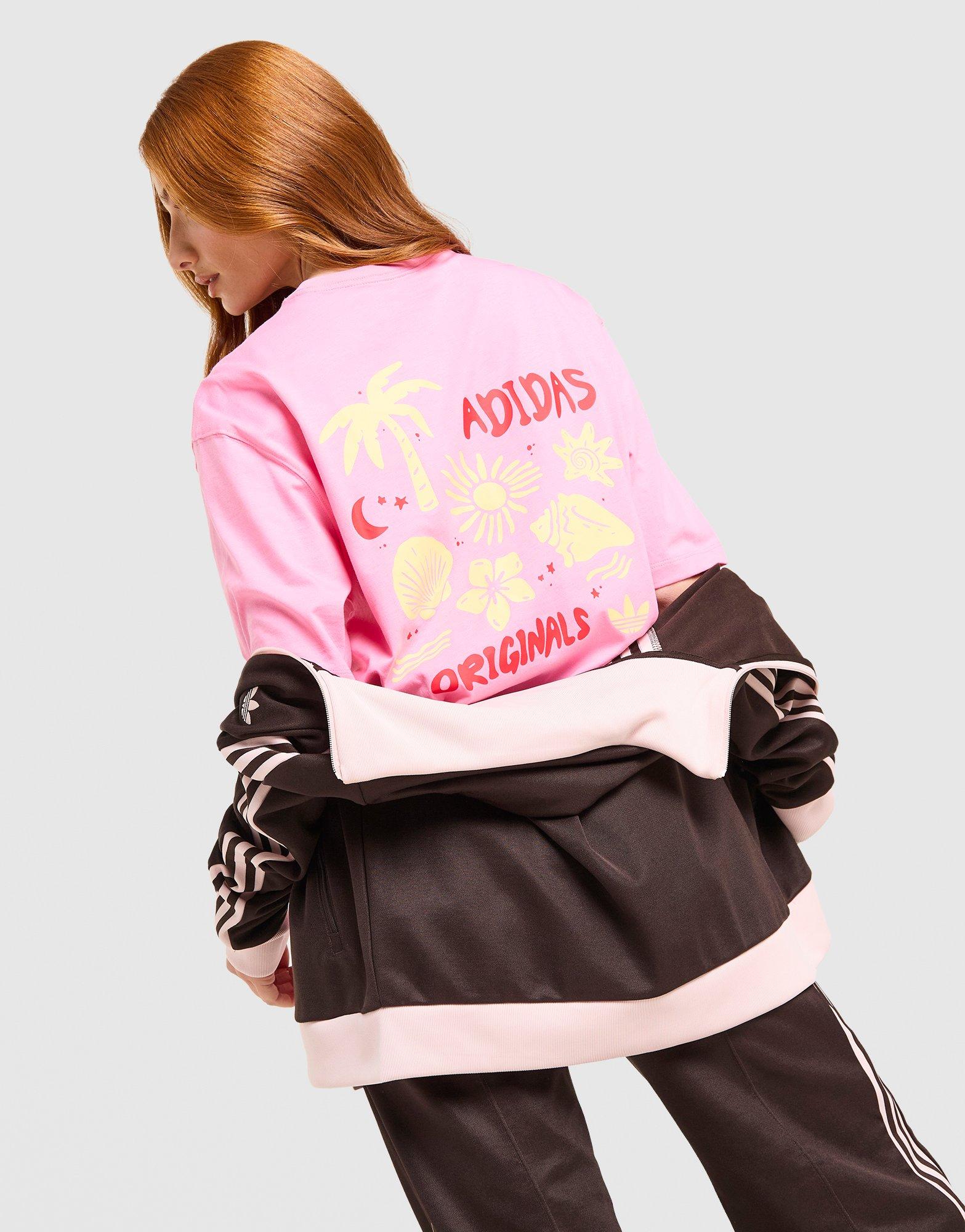 Grab some JD-exclusive style from adidas Originals. This women's Summer Shells T-Shirt is cut from soft cotton fabric. It has short sleeves with a ribbed crew neckline and lands loose and roomy for a relaxed wear. Coming in Bliss Pink, it's finished with beach-inspired graphics. Machine washable | Our model is 5'6" and wears a size S. | LF3276