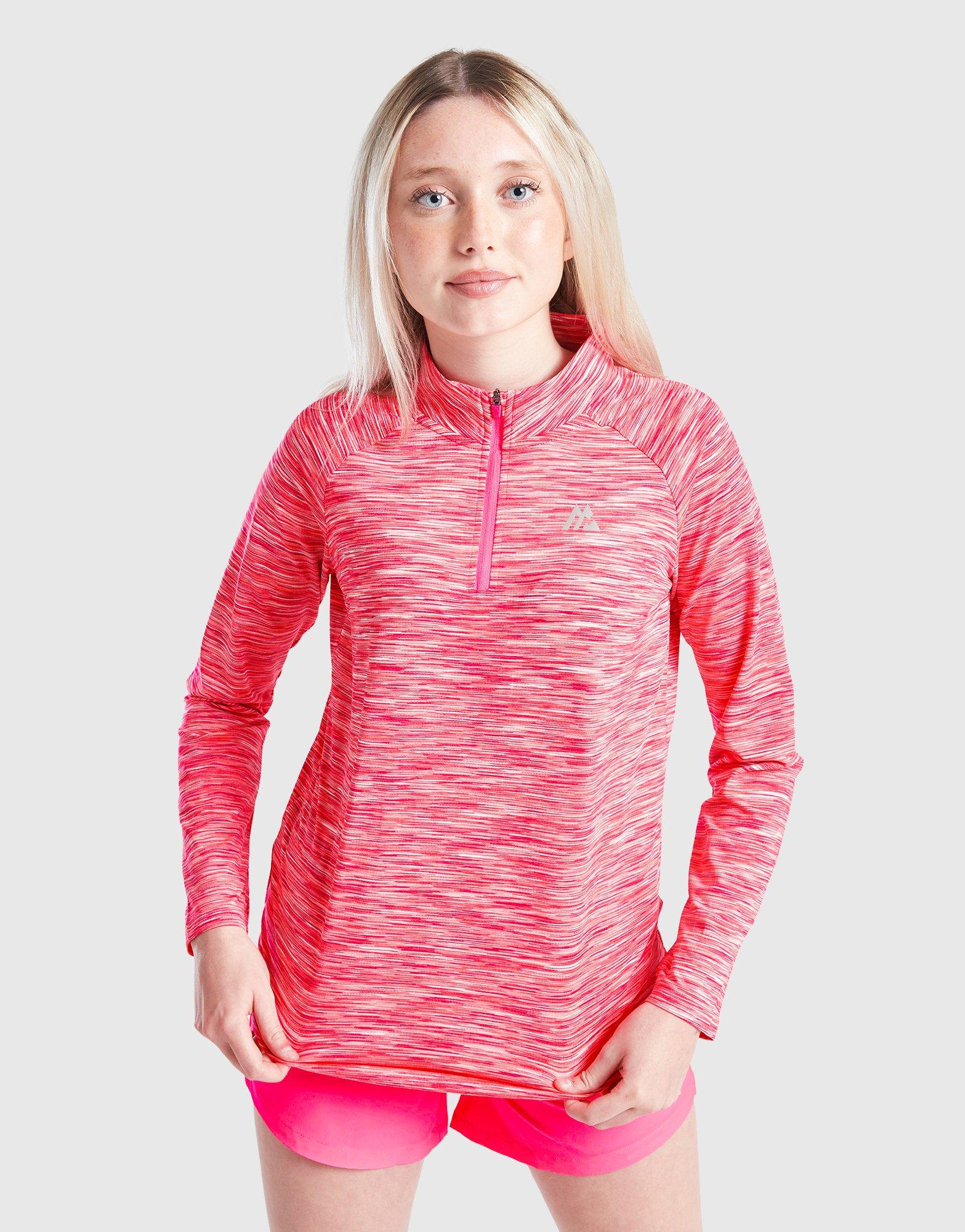 A look that matches your energy. Grab this junior girls' Trail 1/2 Zip Top and stand out. Reflective Montirex branding is stamped to the chest and pink space dye fabric is soft, stretchy and breathable. A quarter zip fastening and sleeve thumbholes switch up the fit. Machine washable.