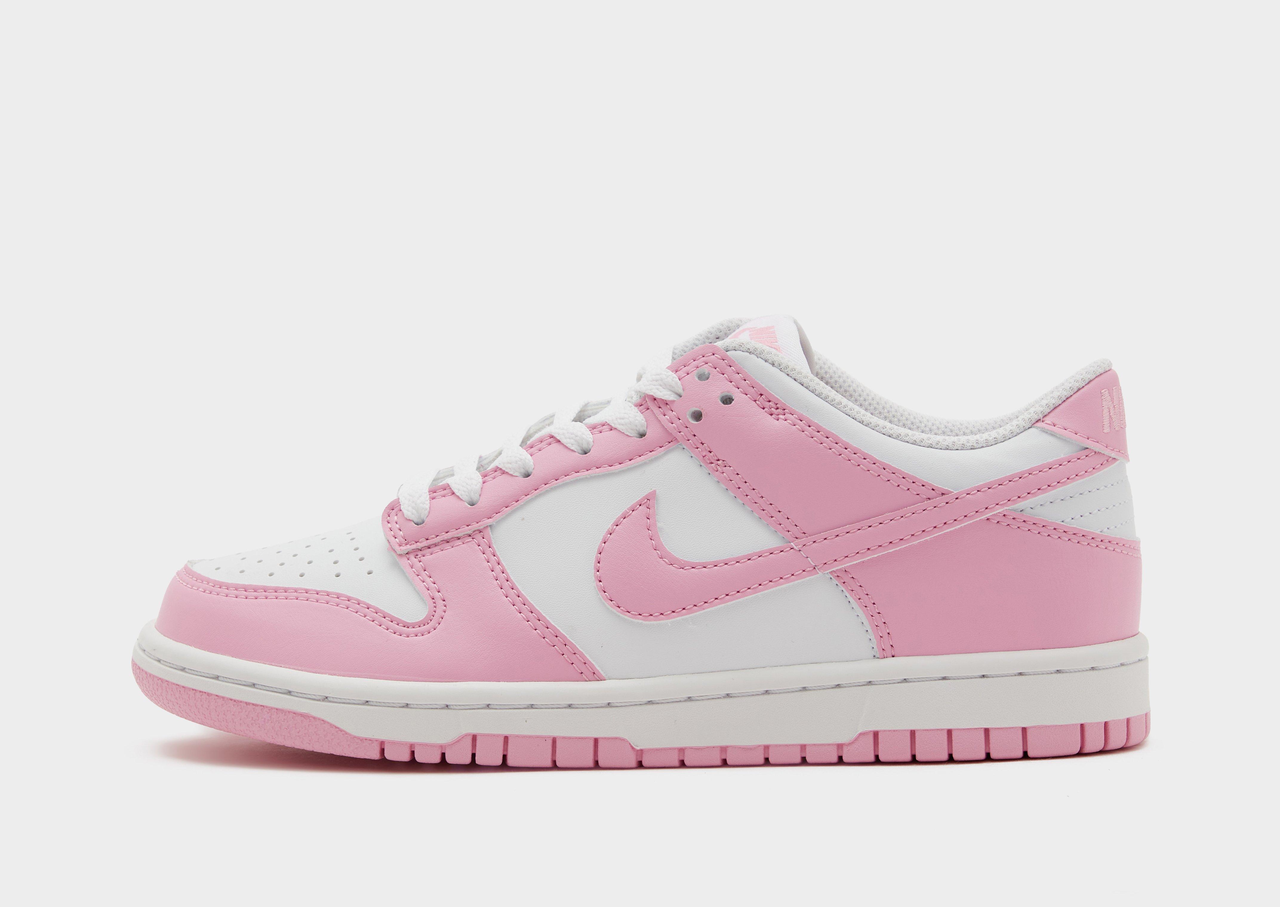 A hoops hero lands in bold colours with these juniors' Dunk Low sneakers from Nike. Dropping in Pink Rise and white, the colour block upper is made from smooth synthetic leather for durable comfort. Perforations on the toe keep air flowing, while the cushioned midsole sits above a full-length rubber outsole with OG tread. Finished with the iconic Swoosh on the sidewalls.