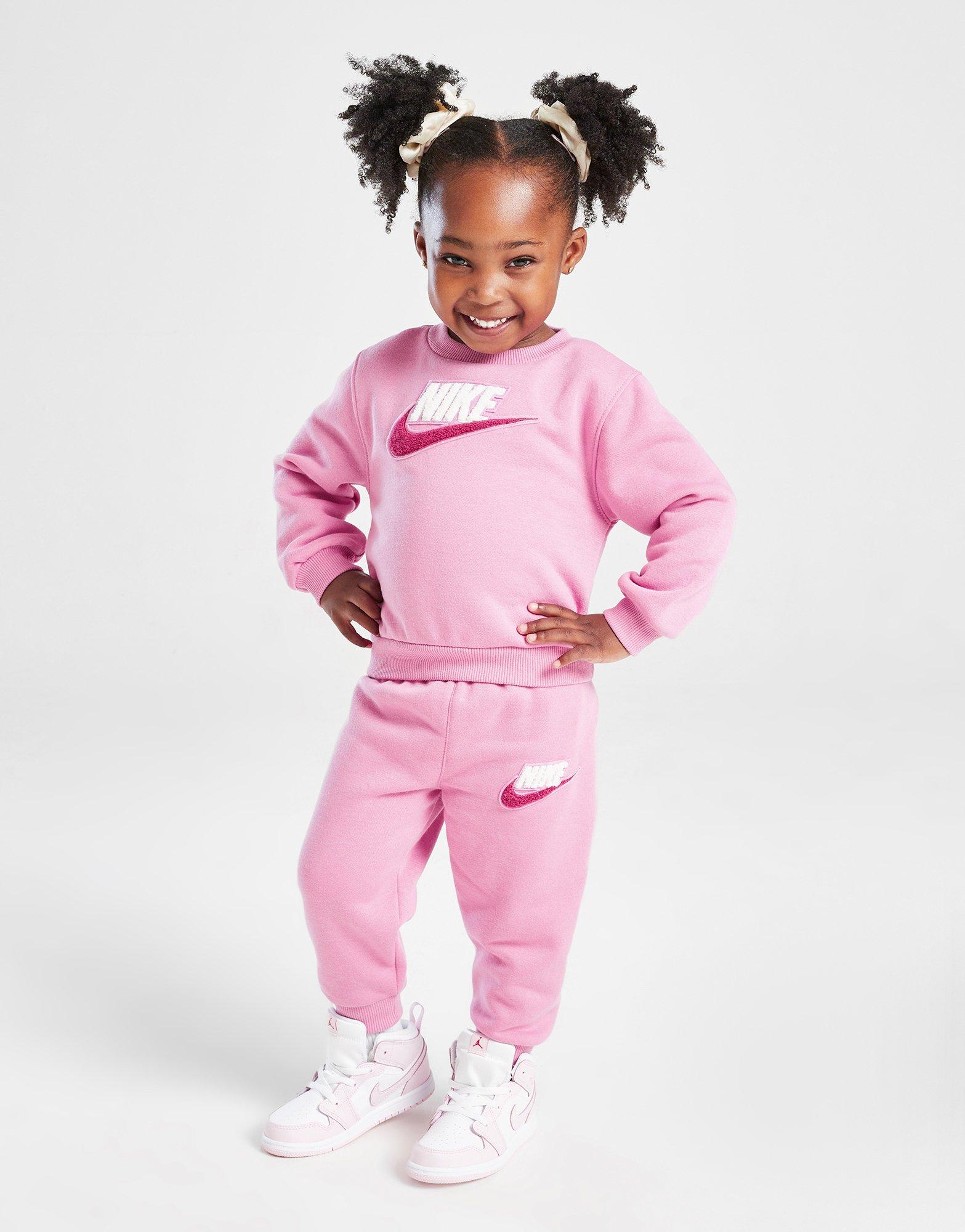 Exclusive to JD. Upgrade your little one's lowkey looks with this infant girls' Chenille Crew Tracksuit from Nike. In a Pink colourway, this set is made with plush brushed fleece for snug comfort. It has a long-sleeve sweatshirt with a classic crew neckline, and snap buttons at the nape for an easy feel. The matching joggers have an elastic waistband for a snug, secure fit. With stretchy ribbed trims, it's finished with a fuzzy chenille Swoosh and Nike branding. Machine washable.