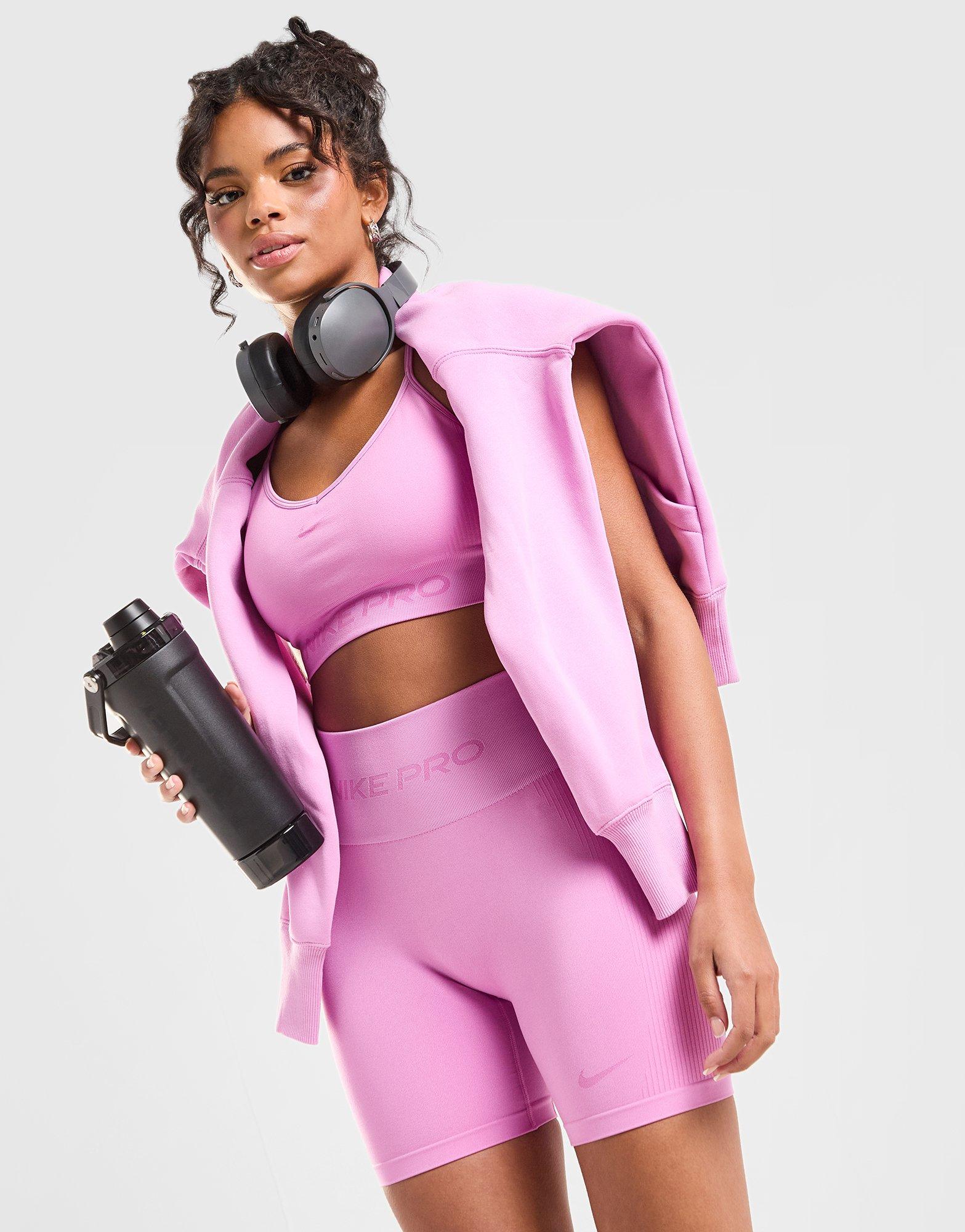 Got a class booked? Get prepped with this women's Nike Training Pro Seamless Sports Bra. In a Light Magenta shade, this light-support sports bra is made for low-impact workouts. Removable pads and a soft, stretchy fabric offer a secure and flattering fit. Ribbed detailing adds comfort, while Dri-FIT tech removes sweat for a cool feel. Finished with tonal Swoosh and Nike Pro branding. Machine washable. | Our model is 5'6" and wears a size S.