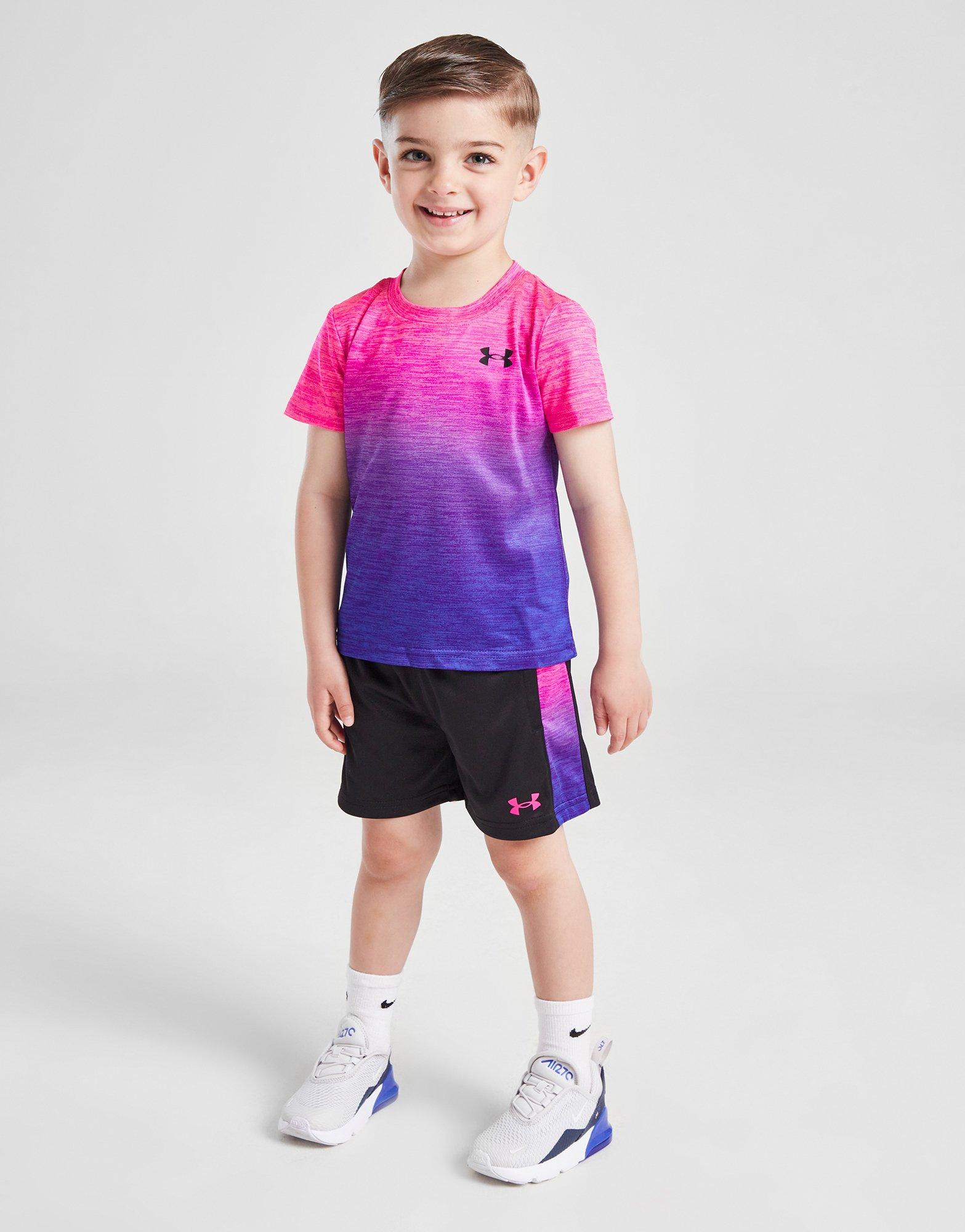 Keep them cool all day long in this infants' UA Tech Fade T-Shirt/Shorts Set from Under Armour. Cut from super-smooth, lightweight UA Tech fabric for sweat-wicking comfort, this JD-exclusive set includes a Pink to Purple gradient tee, with a classic crew neckline and short sleeves. The matching Black shorts have gradient inserts, and an elastic waistband for an easy fit. Finished up with signature Under Armour branding. Machine washable.