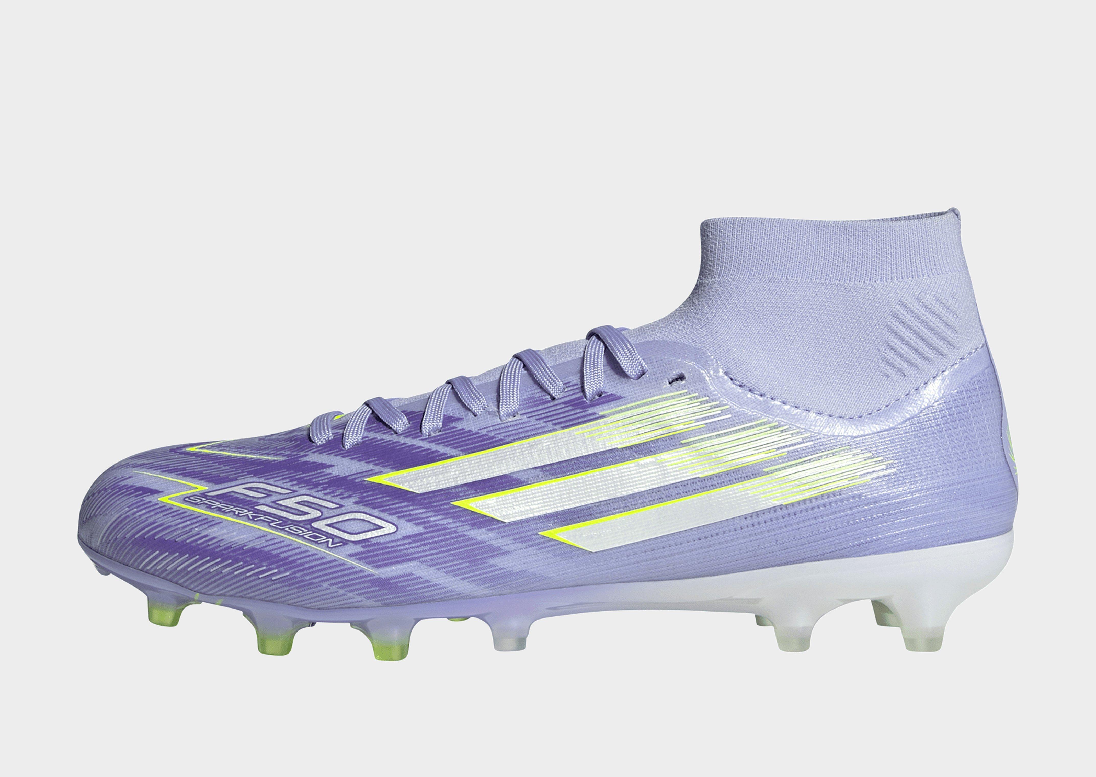 Designed for her. Light up the pitch in supportive F50 Sparkfusion boots created specifically for female athletes. Keeping you locked in with an adidas PRIMEKNIT collar, the Fibertouch upper on these Pro football boots sits on a Fusionlast for an anatomical fit and a Fusionsole for arch support. A specially created Sprintshell Fusion outsole supports women's biomechanics for increased agility on multiple surfaces.