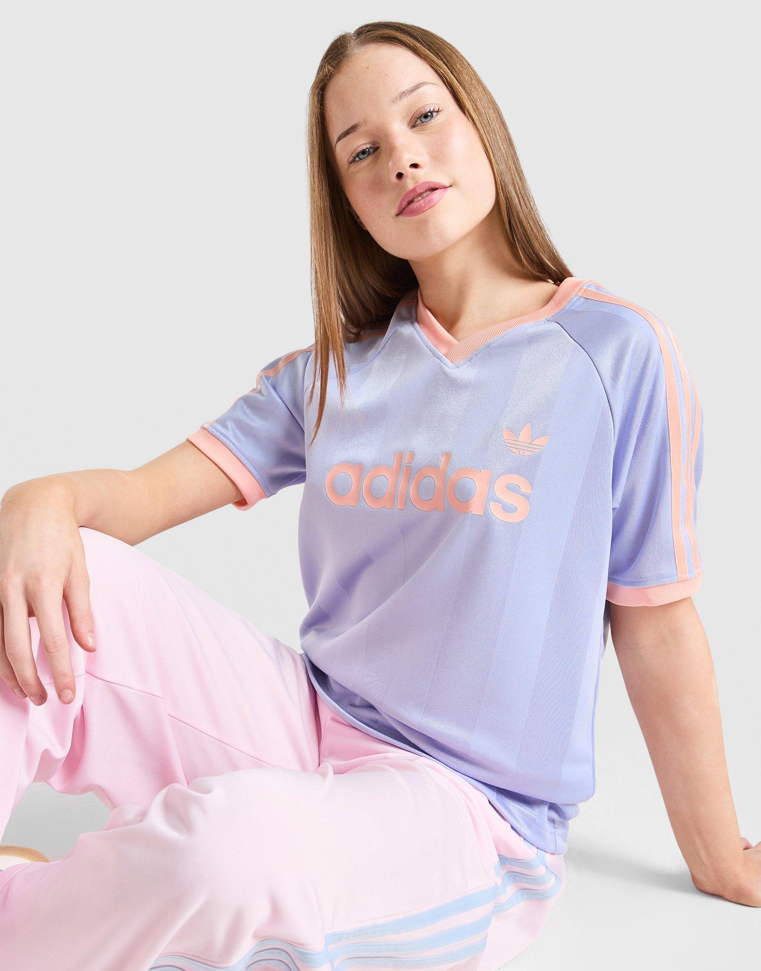 Step out in JD-exclusive style from the 3-Stripes. This junior girls' Football T-Shirt from adidas Originals is cut from light, breathable fabric. Landing baggy, it's got a V-neckline and short sleeves for a classic look. In Violet Tone, it's finished with Glow Pink 3-Stripes and adidas branding. Machine washable. | KT9745