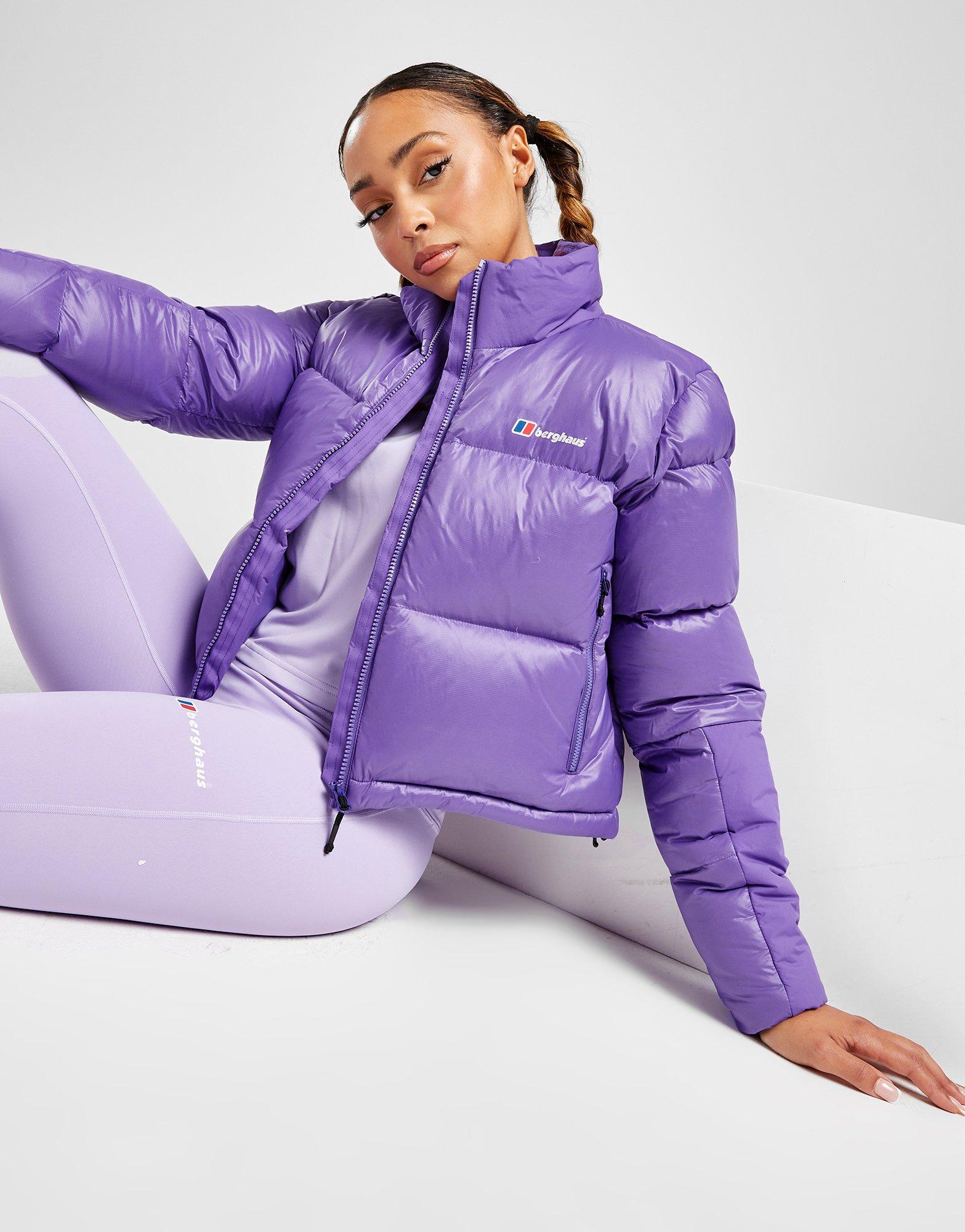 Stand out and conquer the elements in this women's Arkos Crop Jacket from Berghaus. In a Purple colourway, this full zip coat is made from durable poly fabric, paired with a water-repellent HydroDown finish to keep you dry and comfy. Packed with ultra-lightweight padding for extra heat, it features a stand-up collar and cropped hem for a boxy fit. Finished off with zippered side pockets and signature Berghaus branding to the chest. Machine washable. | Our model is 5'8" and wears a size 8.