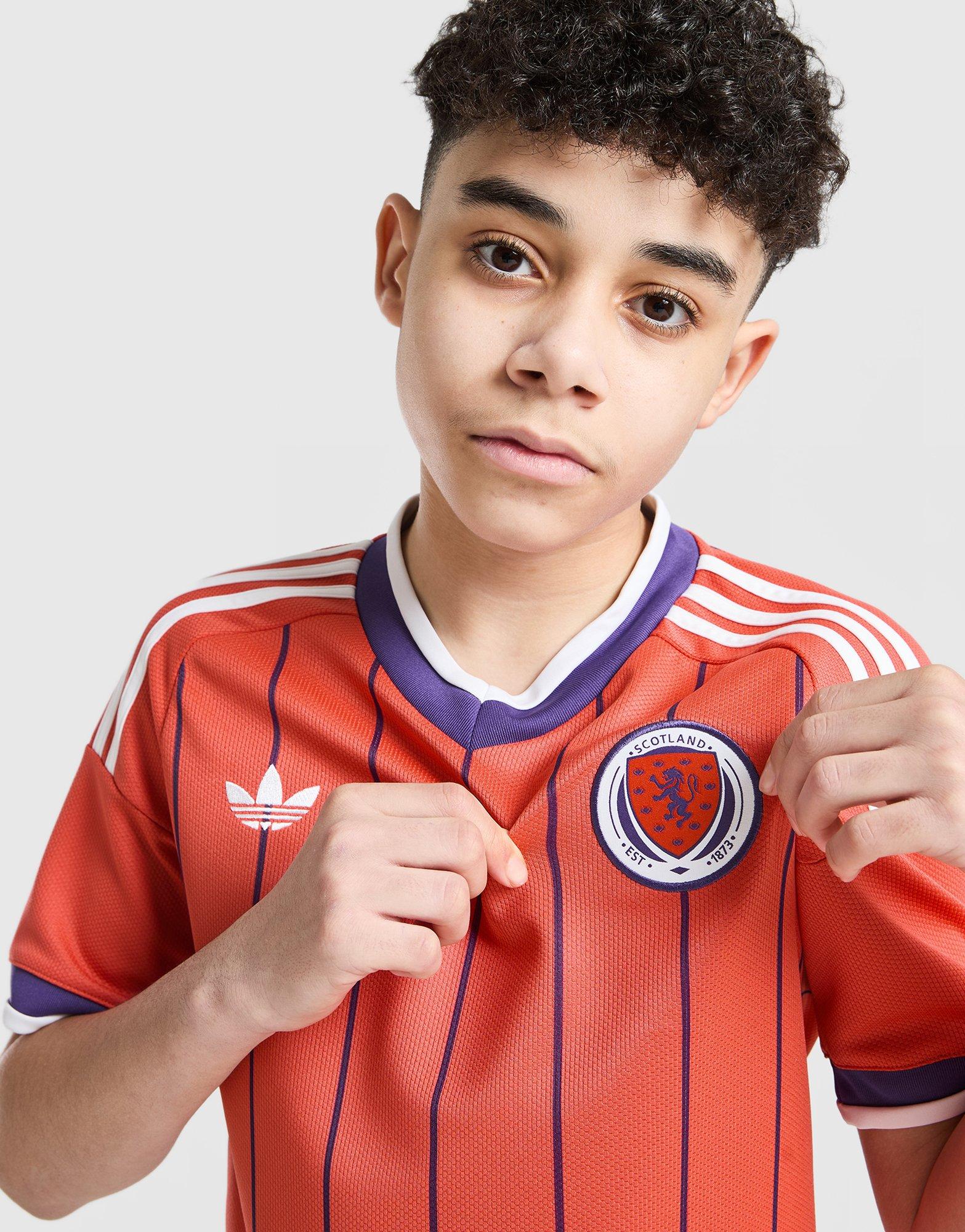 Back on the big stage. Get behind your nation in this juniors' Scotland 2026 Away Shirt from adidas Originals. In Trace Scarlet, it's got navy blue pinstripes for a retro look. It has a crew neckline and shirt sleeves with CLIMACOOL tech to remove sweat when things heat up. Finished with 3-Stripes, a Trefoil logo and the Scotland crest at the chest. Machine washable. | JZ9200